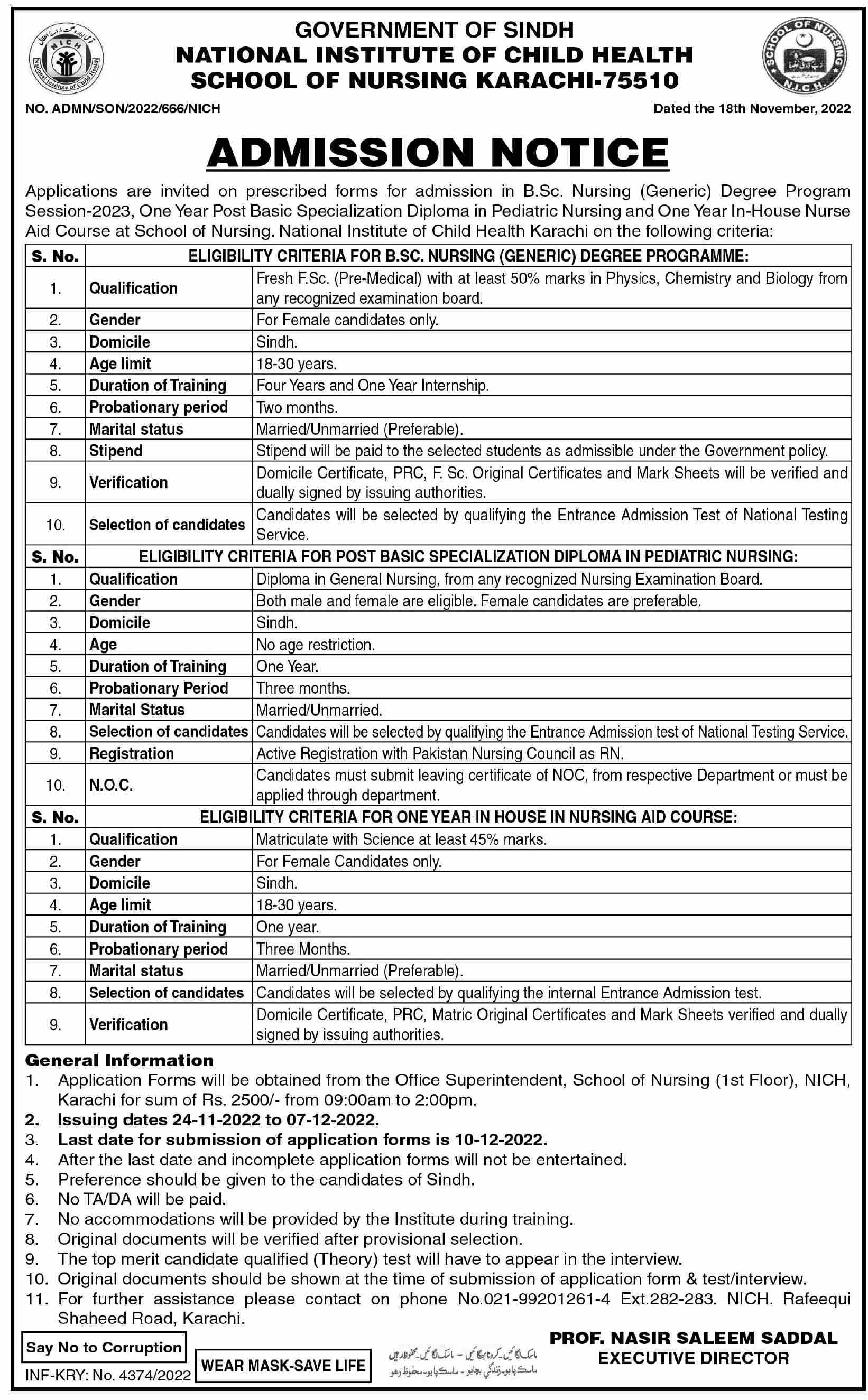 National Institute of Child Health School of Nursing Karachi admission 2022