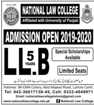 National Law College Lahore has announced admissions for 5 year LLB program. Admission open 2019-20. Special Scholarship are available. Limited seats. Affiliated with University of Punjab.
