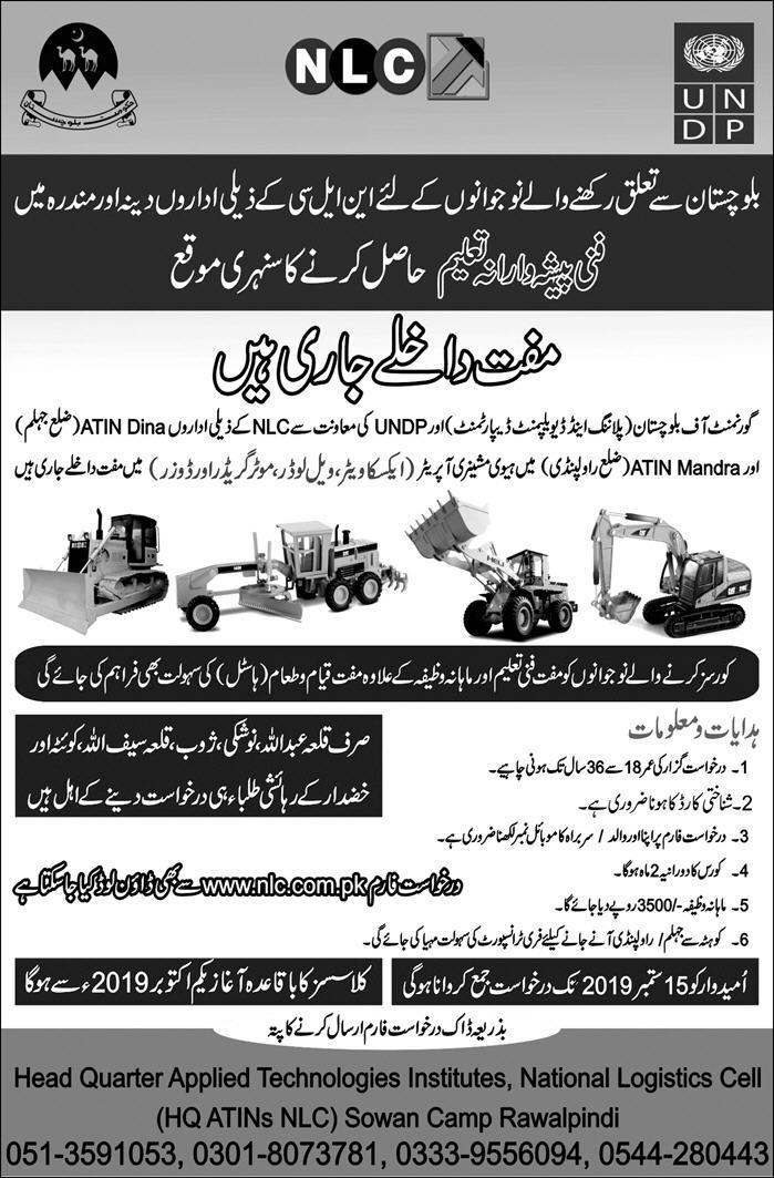 National Logistics Cell Rawalpindi has announced admissions for Diploma in Heavy Machinery Operator, for citizens of Balochistan with the Collaboration of Govt.of Balochistan. Last date to apply 15 Sep 2019.