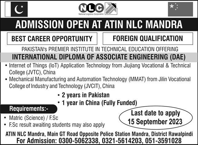 The National Logistics Corporation NLC has opened its doors for admissions in 2023, offering an extraordinary opportunity for Pakistani students to embark on a path to international technical education. NLC, Pakistans premier institute in technical education, is set to provide aspiring students with a chance to earn an International Diploma of Associate Engineering DAE in collaboration with renowned institutions from China. This educational initiative not only equips students with cutting-edge knowledge but also enhances their career prospects in the ever-evolving field of technology.