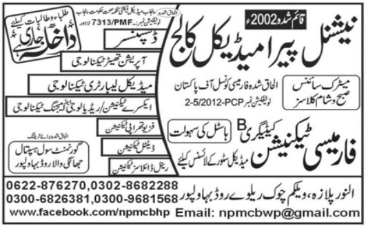 National Pera Medical College Admission 2020 announced for the session of 2020 in the Dispenser, Operation Theater Technology, Medical Laboratory Technology, Medical Laboratory Technology, X Ray Technician, Dental Technician.