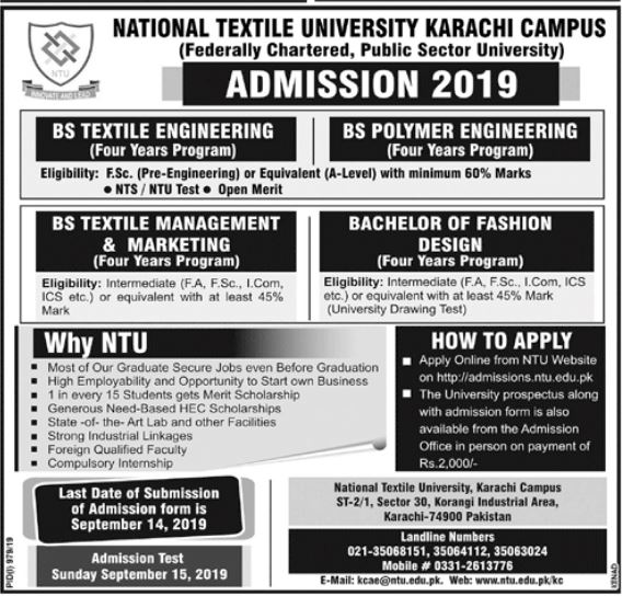 National Textile University Karachi has announced admissions for BS in Textile Engineering, Polymer Engineering, Textile Management & Marketing, Bachelor of Fashion Design. Scholarships are available. Entry test 15 Sep 2019.