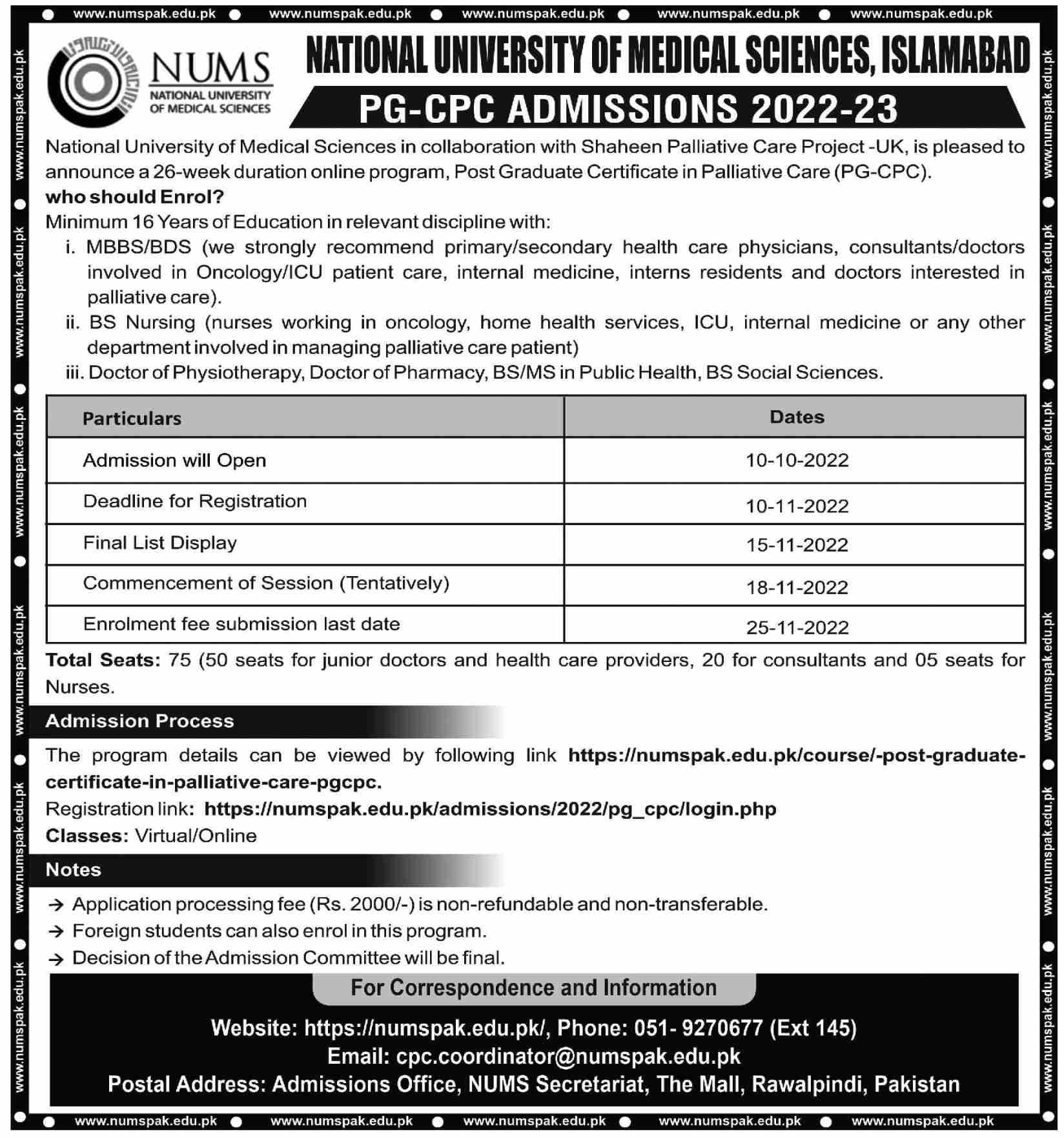 National university of Medical Sciences, Islamabad has announced admission for the year 2022 2023. National university of Medical Sciences, Islamabad is offering post graduation program. those students who are eligible and want to take admission must apply before the due date. the institution is providing a highest standard of education in a better atmosphere.