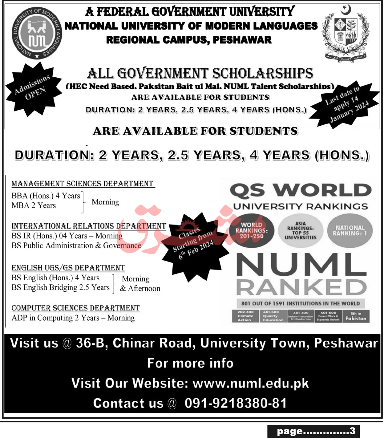 Exciting prospects unfold at the National University of Modern Languages NUML Peshawar as admissions open for the year 2024. Prospective students have until January 14, 2024, to submit their applications, seizing the opportunity to join this prestigious institution.