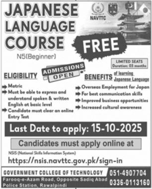 The Government College of Technology, Under NAVTTC Rawalpindi is pleased to announce admissions for the Japanese Language Course N5 Beginner Level. This course is specially designed for beginners who want to learn the fundamentals of Japanese language and culture, opening pathways for overseas employment, improved communication skills, and enhanced business prospects.