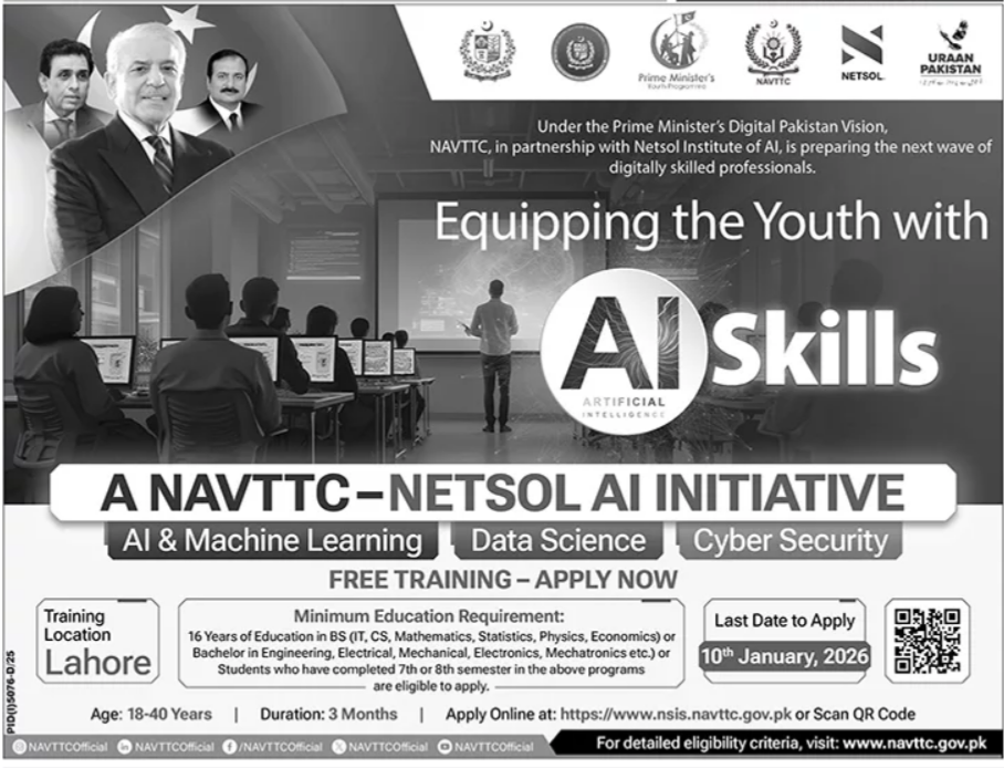 National Vocational & Technical Training Commission NAVTTC, in collaboration with the Netsol Institute of AI, has launched a prestigious initiative aimed at preparing the next generation of digitally skilled professionals. This program focuses on equipping youth with advanced Artificial Intelligence AI and emerging technology skills to meet global industry demands.