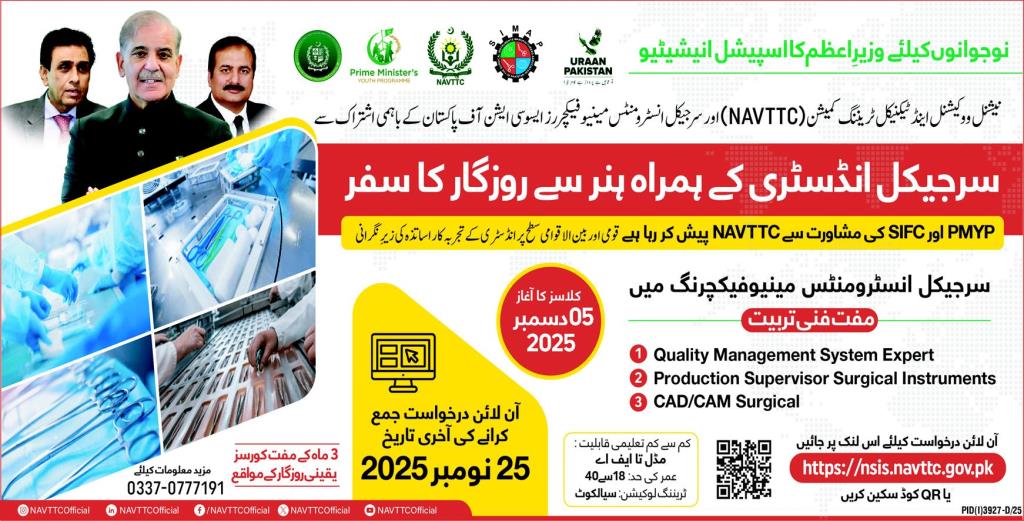 The Prime Minister’s Special Initiative for Youth PMYP, in collaboration with the National Vocational & Technical Training Commission NAVTTC and the Surgical Manufacturers Association of Pakistan, is offering a unique opportunity for young individuals to start a career in the surgical instruments industry.