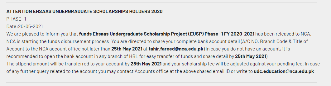 National College of Arts NCA Lahore is giving opportunity to Deserving Students for funds Ehsaas Undergraduate Scholarships, NCA is starting the funds disbursement process. NCA Lahore is inviting and encourage students to apply on prescribed form for funds Ehsaas Undergraduate Scholarships Project (EUSP) Phase-1 FY 2020-2021. Interested students are required to send Form on or before May 25, 2021. The stipend amount will be transferred to account of concerned by May 28, 2021 and scholarship fee will be adjusted against pending fee.