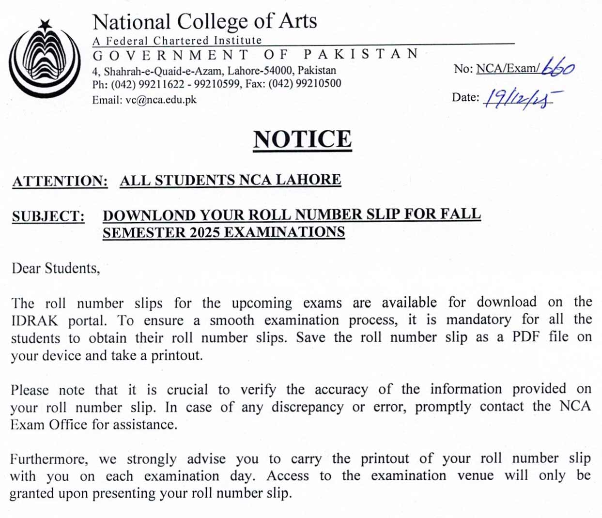 NCA Lahore students, listen up! The National College of Arts released a critical notice. You must download your Roll Number Slip for the upcoming Fall Semester 2025 Examinations. This slip is now available online.