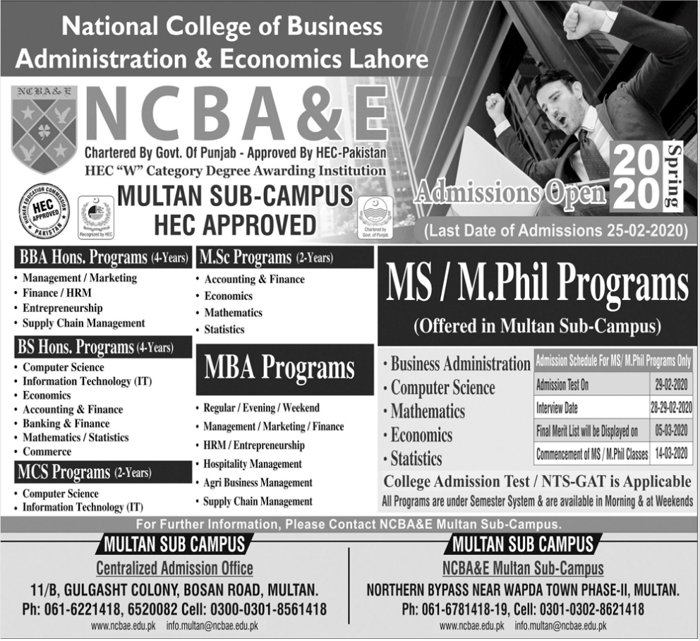 National College of Business Administration & Economics lahore announced the Admission for the session of 2020. The National College of Business Administration & Economics lahore has now starts the Admission in the BBA, BS Hons, MCS Program, MS, MBA, M.Phil.The Admission test will be held on 29th February, 2020.