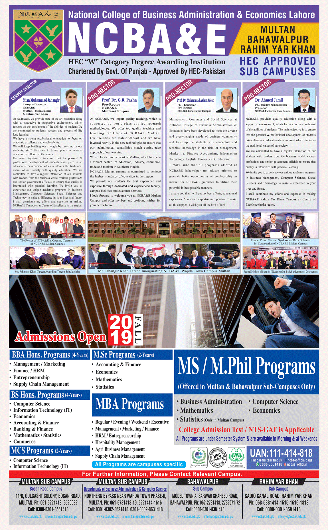 NCBA&E, BS MBA MSc BBA MCS admissions 2019