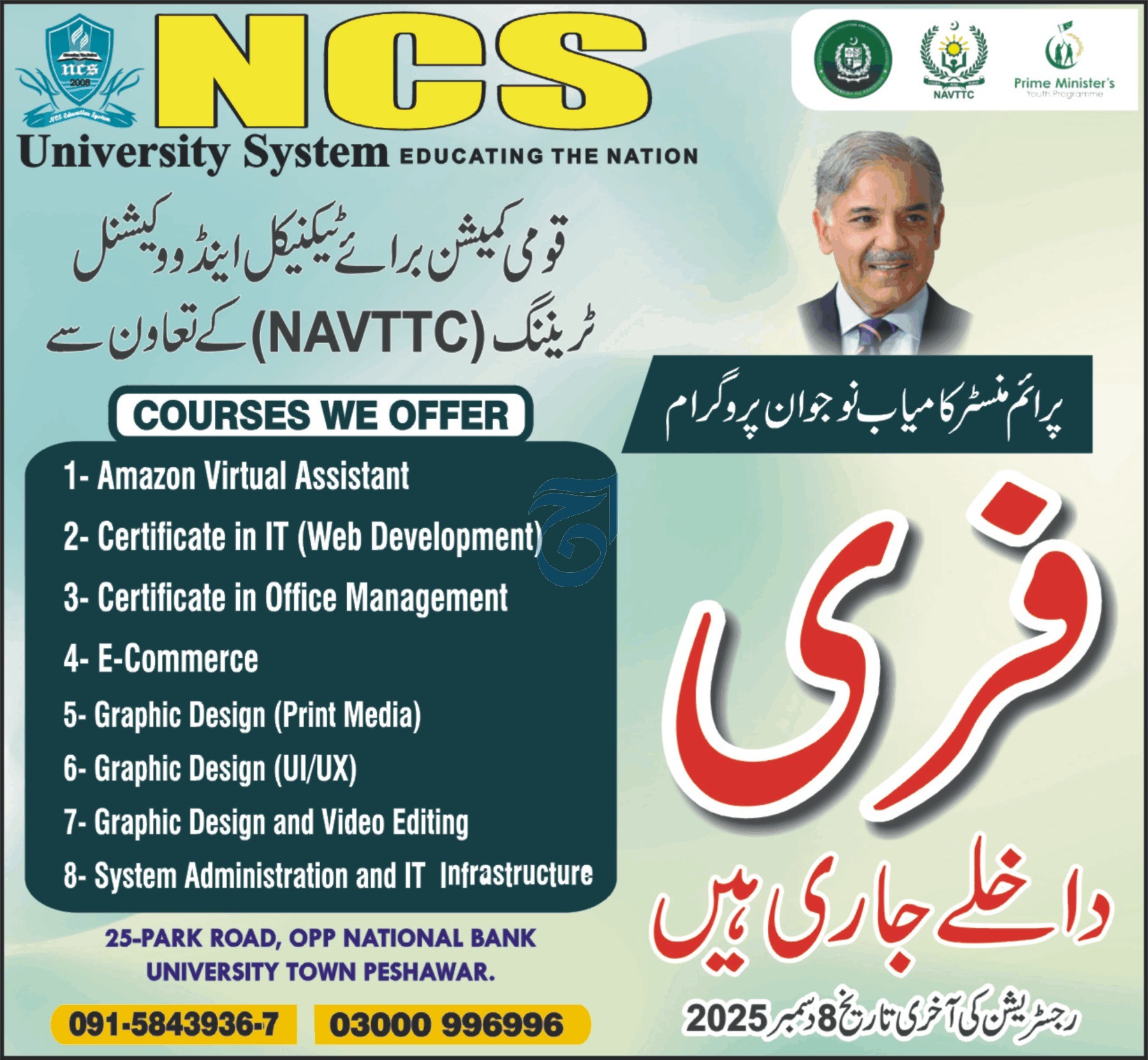 NCS University System, established in 2008, is proud to announce that admissions are now open for its professional and technical courses under the support of NAVTTC National Vocational & Technical Training Commission and the Prime Minister’s Youth Programme. These courses are designed to equip students with industry-relevant skills and prepare them for successful careers in technology, design, and business management.