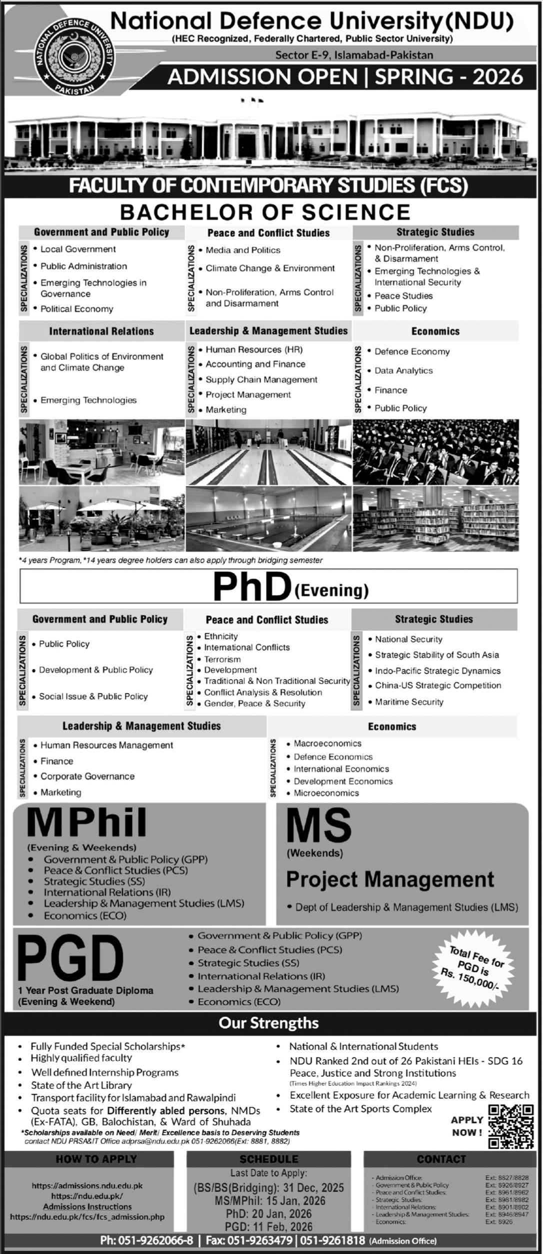 National Defence University NDU stands as Pakistan’s premier institution for national security, strategic studies, governance, public policy, and leadership education. Renowned for producing policy leaders, strategic thinkers, researchers, and public-sector professionals, NDU invites applications for Spring 2026 in its diverse undergraduate and postgraduate programs under the Faculty of Contemporary Studies FCS.