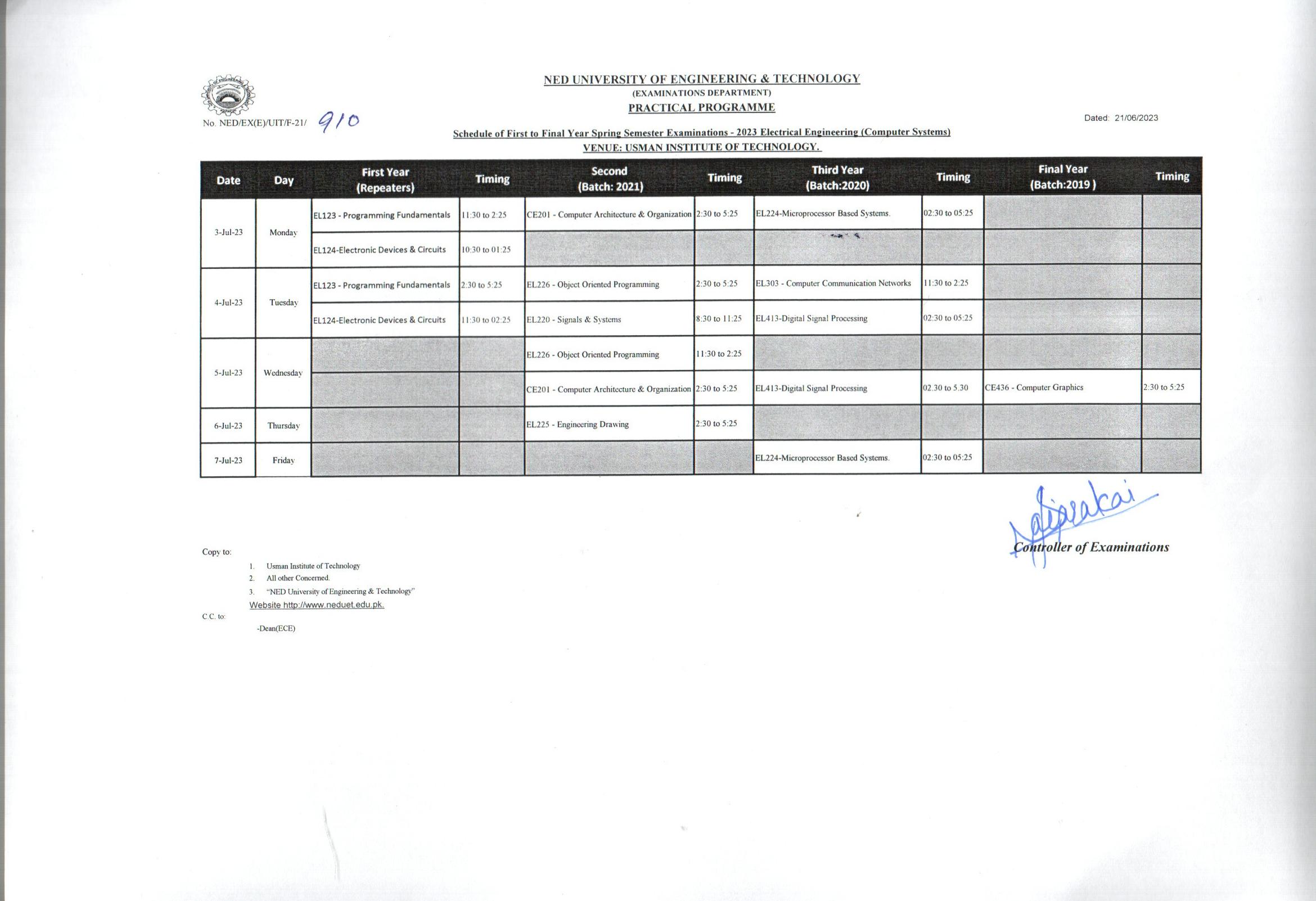 NED UET BS Electrical Engg Theory and Practical Exam Schedule Spring 2023