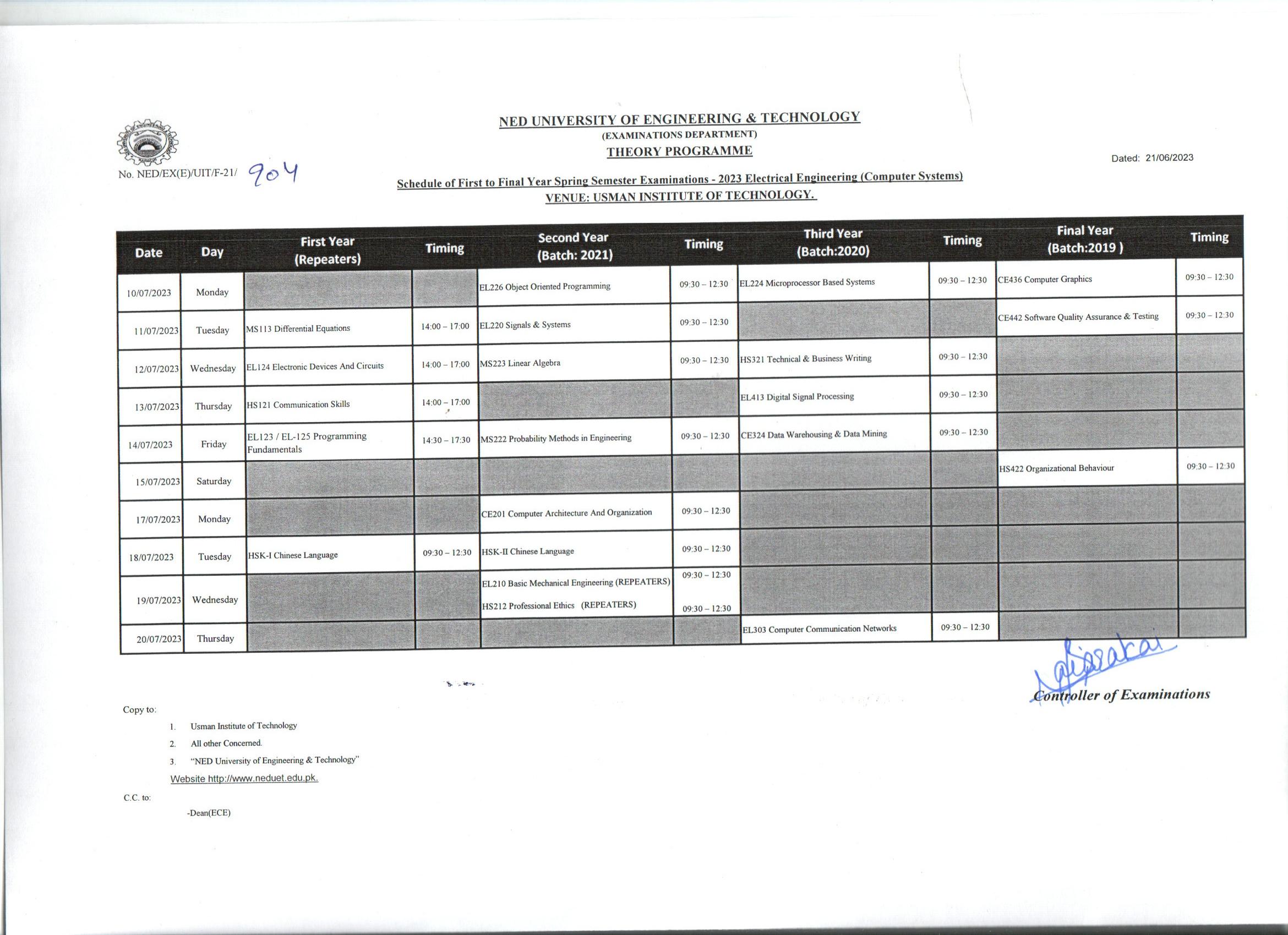 The NED University of Engineering and Technology has released the eagerly awaited date sheet for BS Electrical Engineering students, encompassing 1st to Final Year Theory and Practical Exams for the Spring 2023 semester. This comprehensive schedule ensures that students are well-prepared and organized for their examinations. The exams are set to commence on 10th July 2023 and will continue until 20th July 2023, providing ample time for students to demonstrate their knowledge and skills. With the inclusion of both theory and practical exams, the university aims to assess students theoretical understanding and practical application of concepts. This date sheet 2023 allows students to plan their studies effectively and allocate sufficient time to each subject. It serves as a crucial roadmap for BS Electrical Engineering students, guiding them towards a successful academic journey at the NED University of Engineering and Technology .
