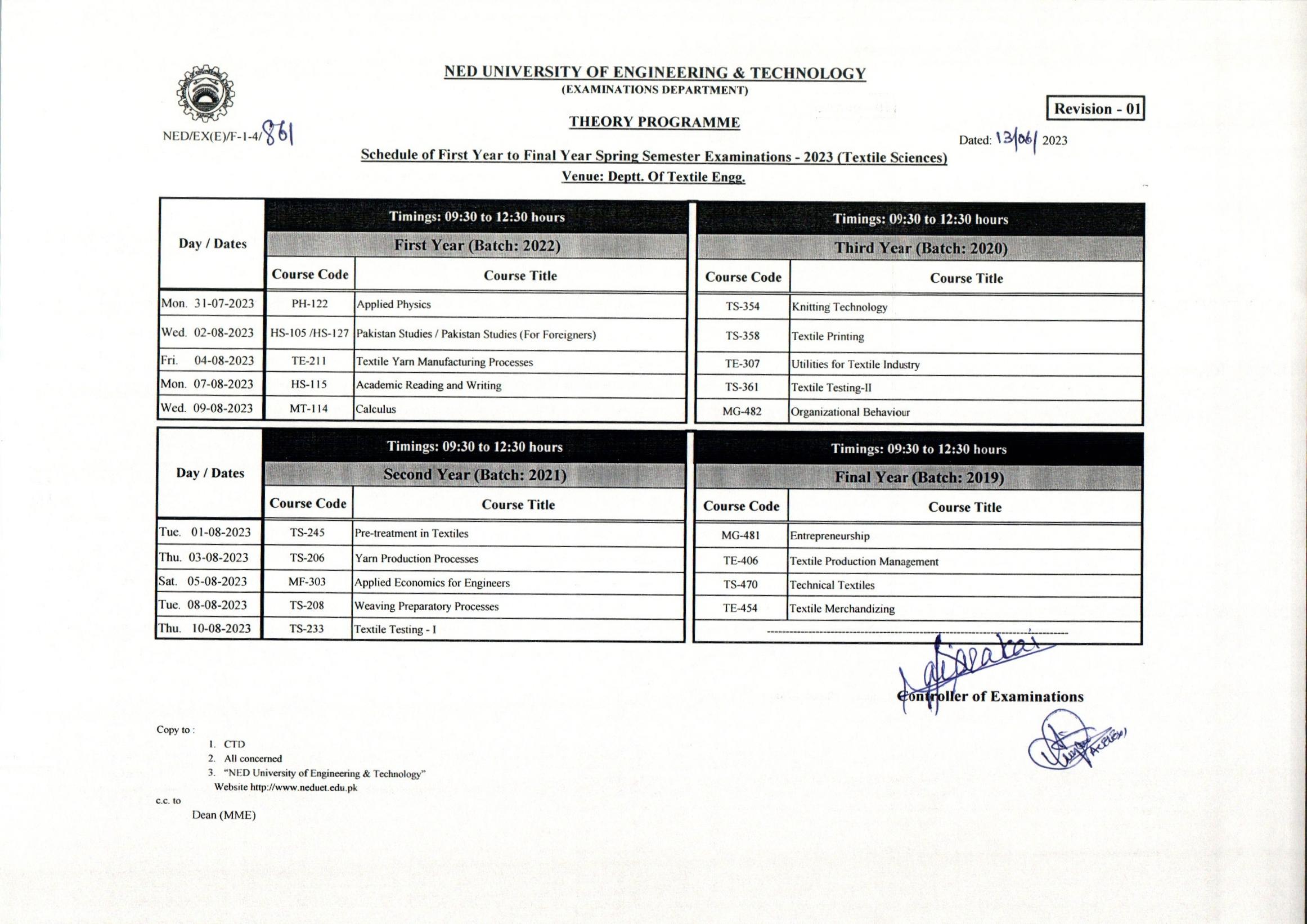 NED UET BS Textile Sciences 1st to Final Year Exam Spring 2023 Date Sheet