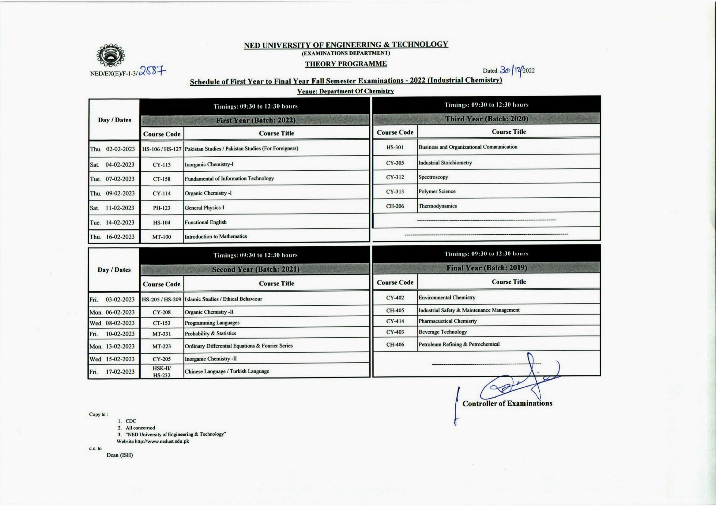 NED UET First to Final Year BS Industrial Chemistry Exam 2022 Schedule