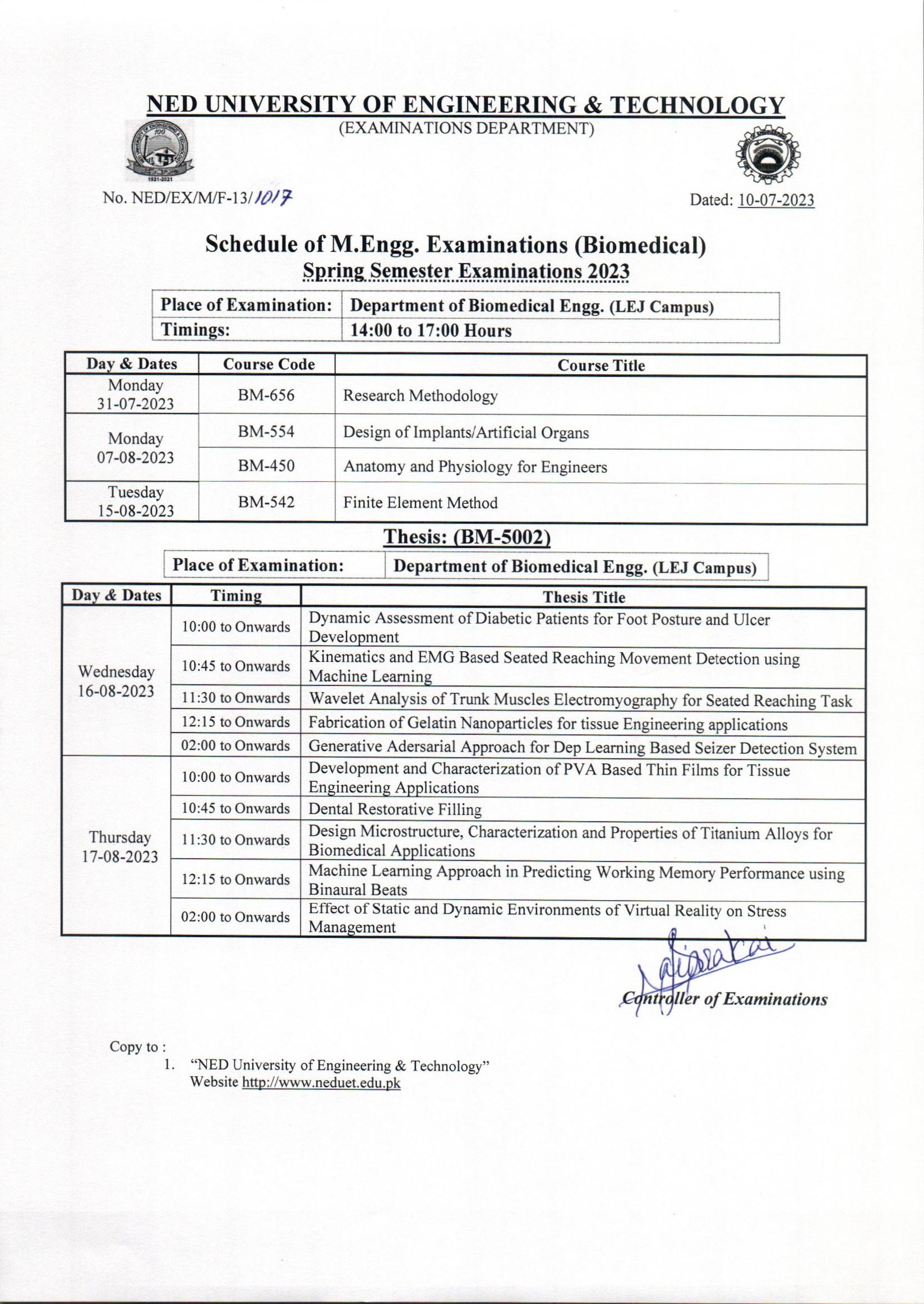 NED UET ME Biomedical Engineering Spring Semester Exam Date Sheet 2023