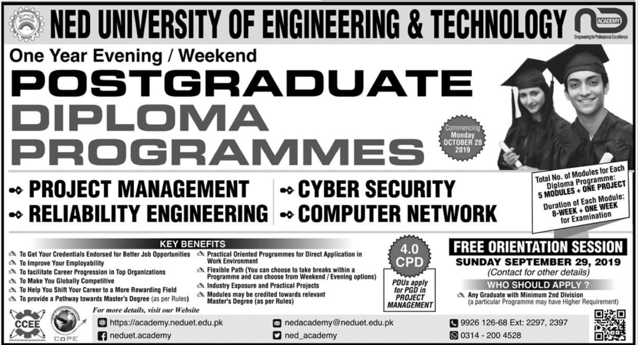 NED University of Engineering & Technology Karachi has announced admissions for Postgraduate Diploma Programs in Project Management, Cyber Security, Computer Network, Reliability Engineering. Any Graduate with 2nd division is eligible to apply.