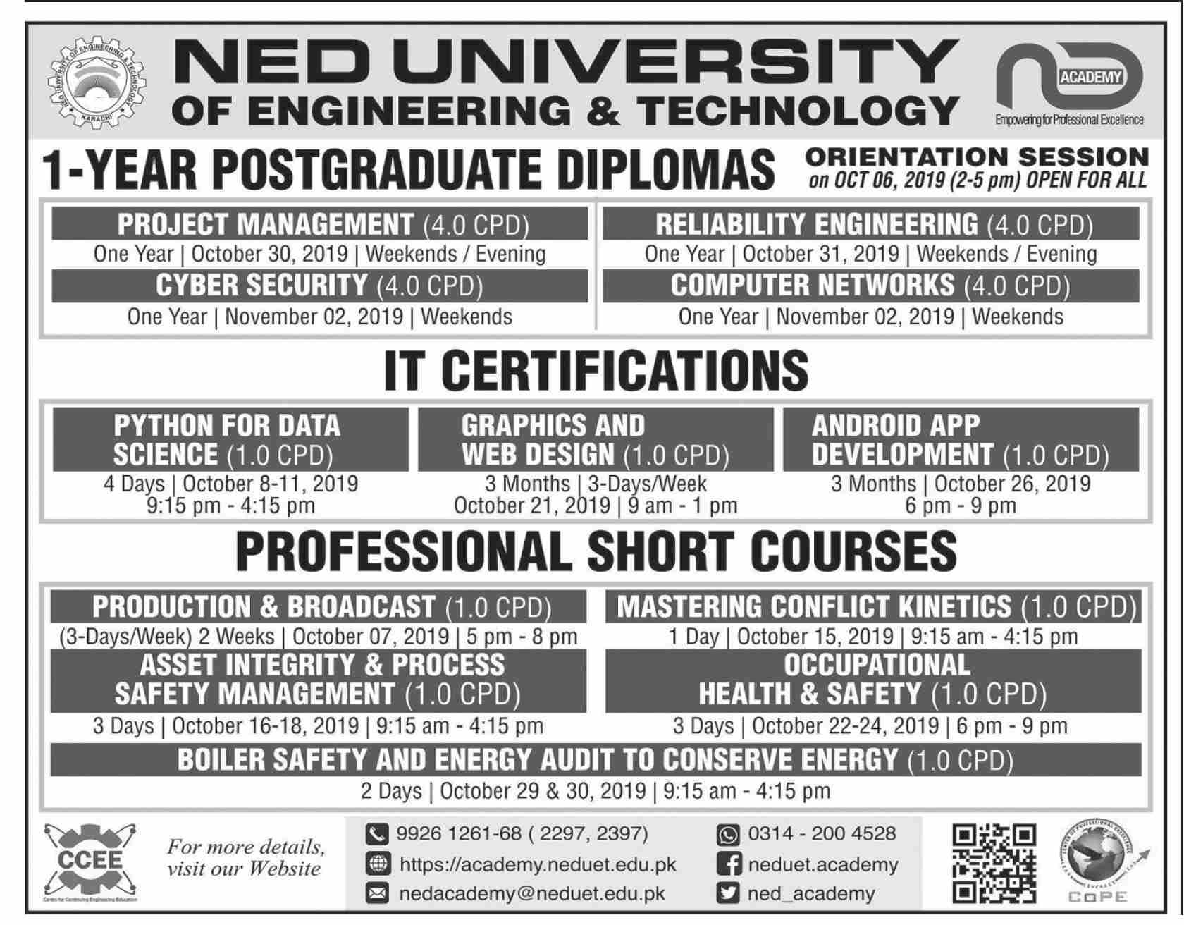 NED University of Engineering & Technology Karachi has offered admissions for 1 year Post Graduate Diploma in Project Management Management, Reliability Engineering, Cyber Security, Computer Networks, Short Courses in Graphic and Web design, Android App Development, Production & Broadcast.