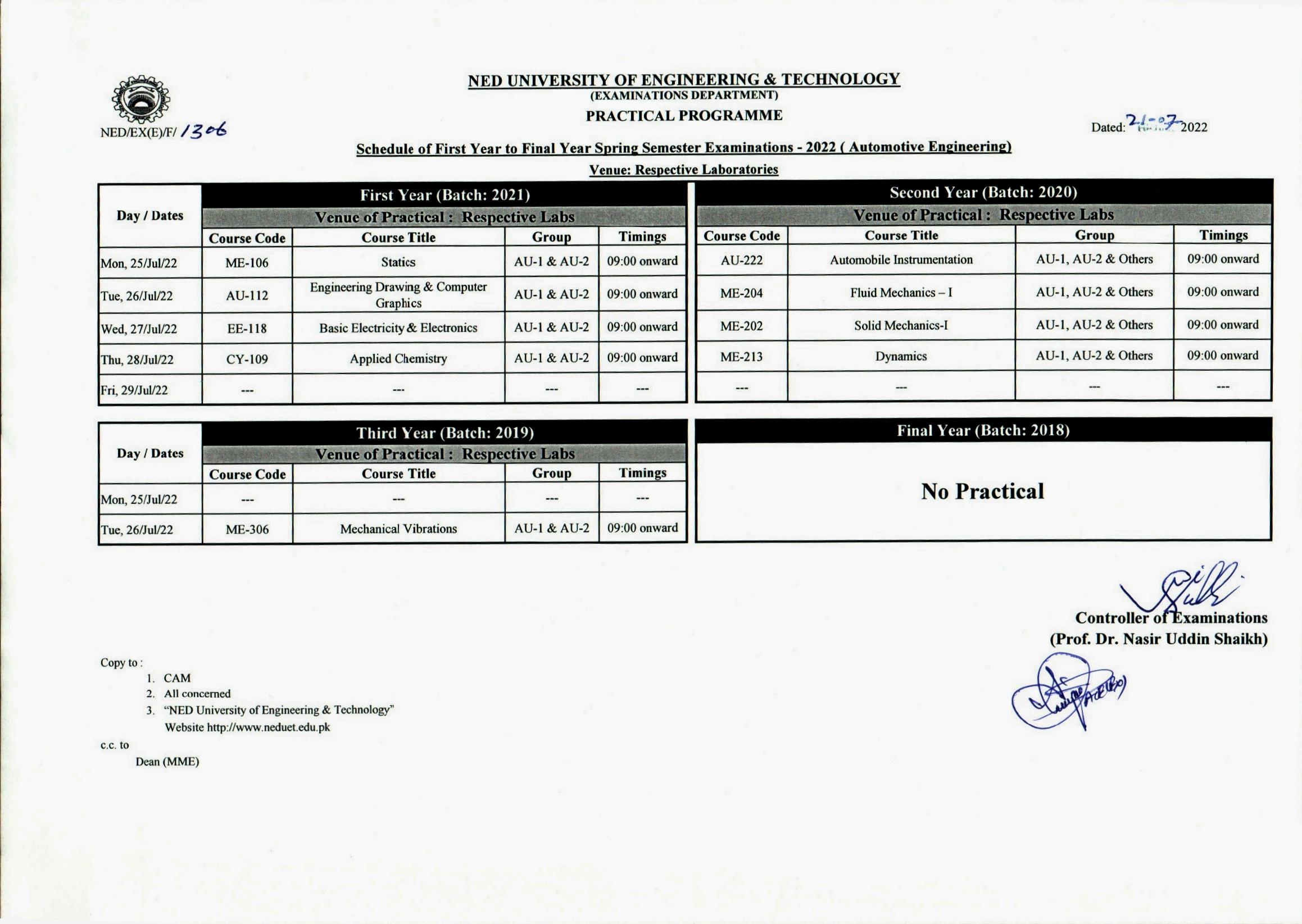NED University BE Automotive Engineering Exams Practical Datesheet 2022