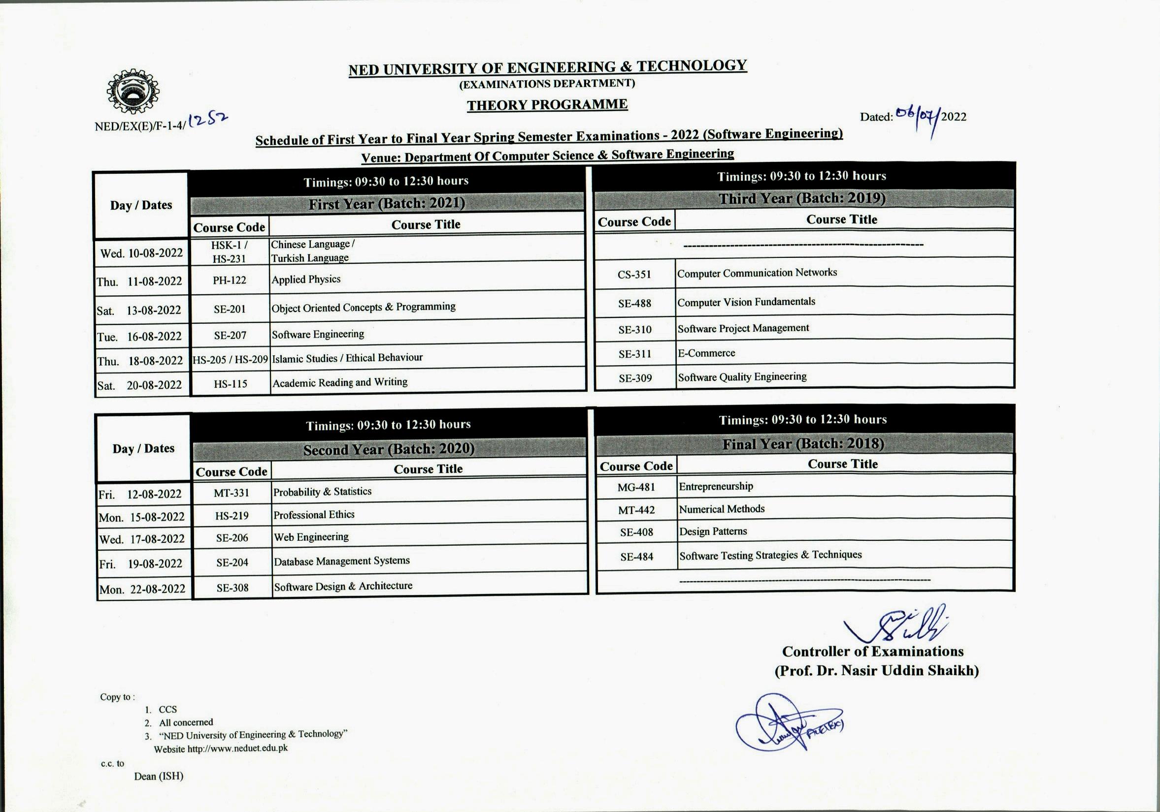 NED University BE Software Engineering Exams 2022 Datesheet