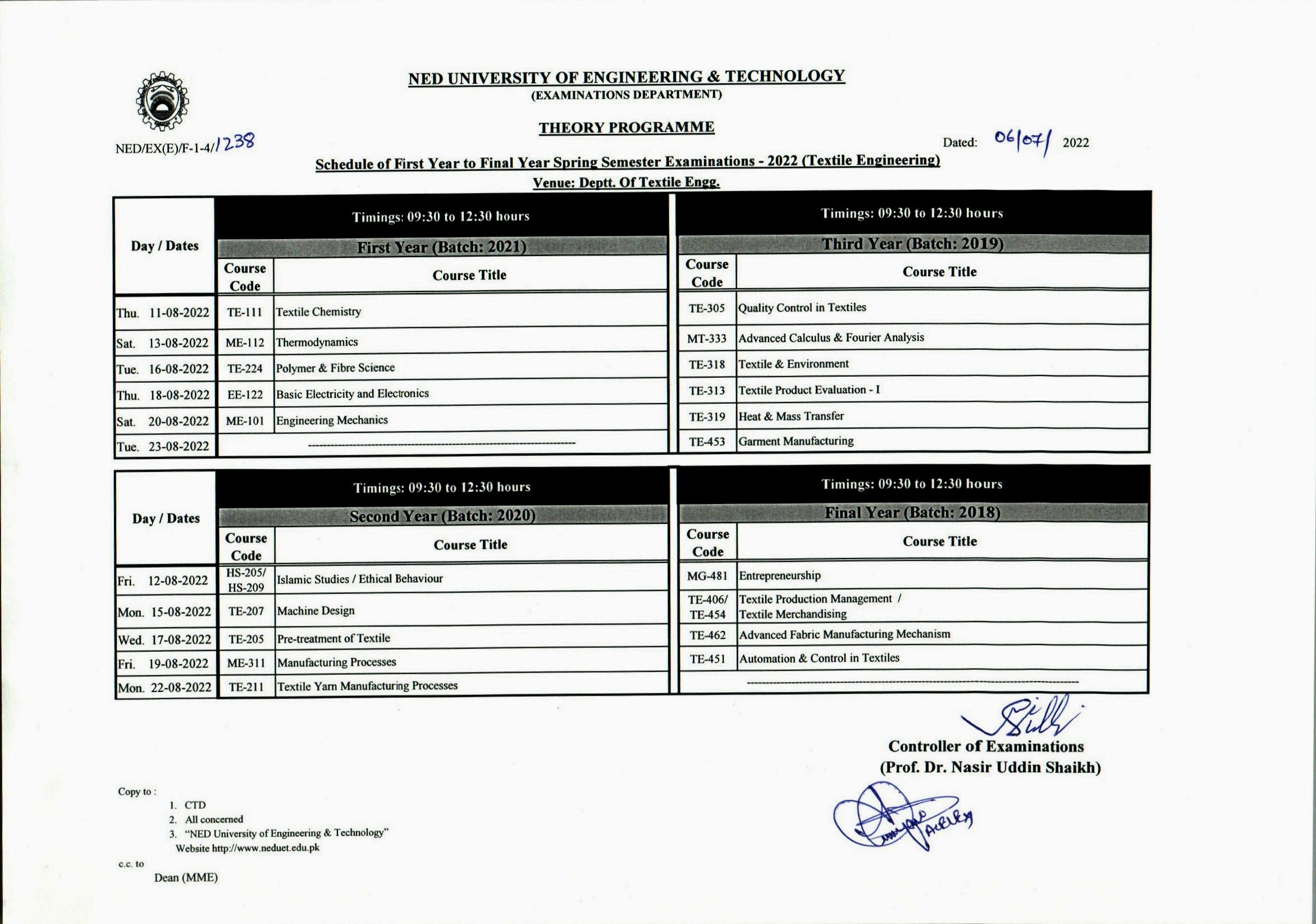 NED University BE Textile Engineering Exams 2022 Date Sheet