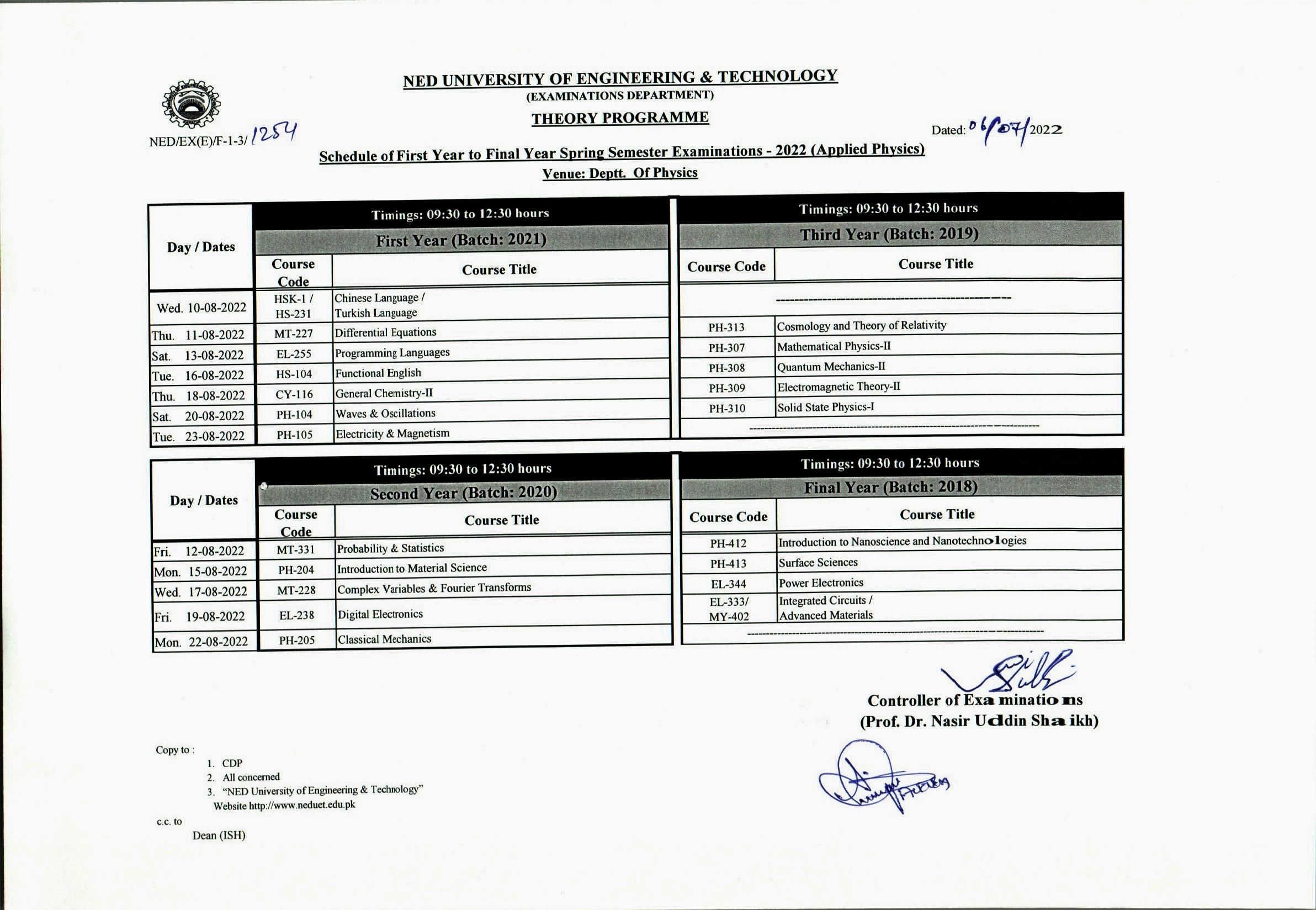 NED University of Engineering and Technology Karachi Examinations Authority is apprising to the First Year to Final Year BS Applied Physics students of NEDUET that NEDUET BS Applied Physics Spring Semester Examinations are decided to conduct. Registered candidates will be able to take part in BS Applied Physics Examination 2022 after issuance of NED University BS Applied Physics Exams 2022 Datesheet. NEDUET is going to be started the exam in July. As per updated NEDUET BS Applied Physics First Year Exams 2022 Datesheet, NEDUET BS Applied Physics Second Year Exams 2022 Datesheet, NEDUET BS Applied Physics Third Year Exams 2022 Datesheet, NEDUET BS Applied Physics Final Year Exams 2022 Datesheet students are required to be appeared in exam from July August 08, 2022. Students shall check their respective area in released NEDUET Karachi BS Applied Physics Spring Semester Exams Datesheet 2022. Paper commencement timings is 09:30 am to 12:30 pm.