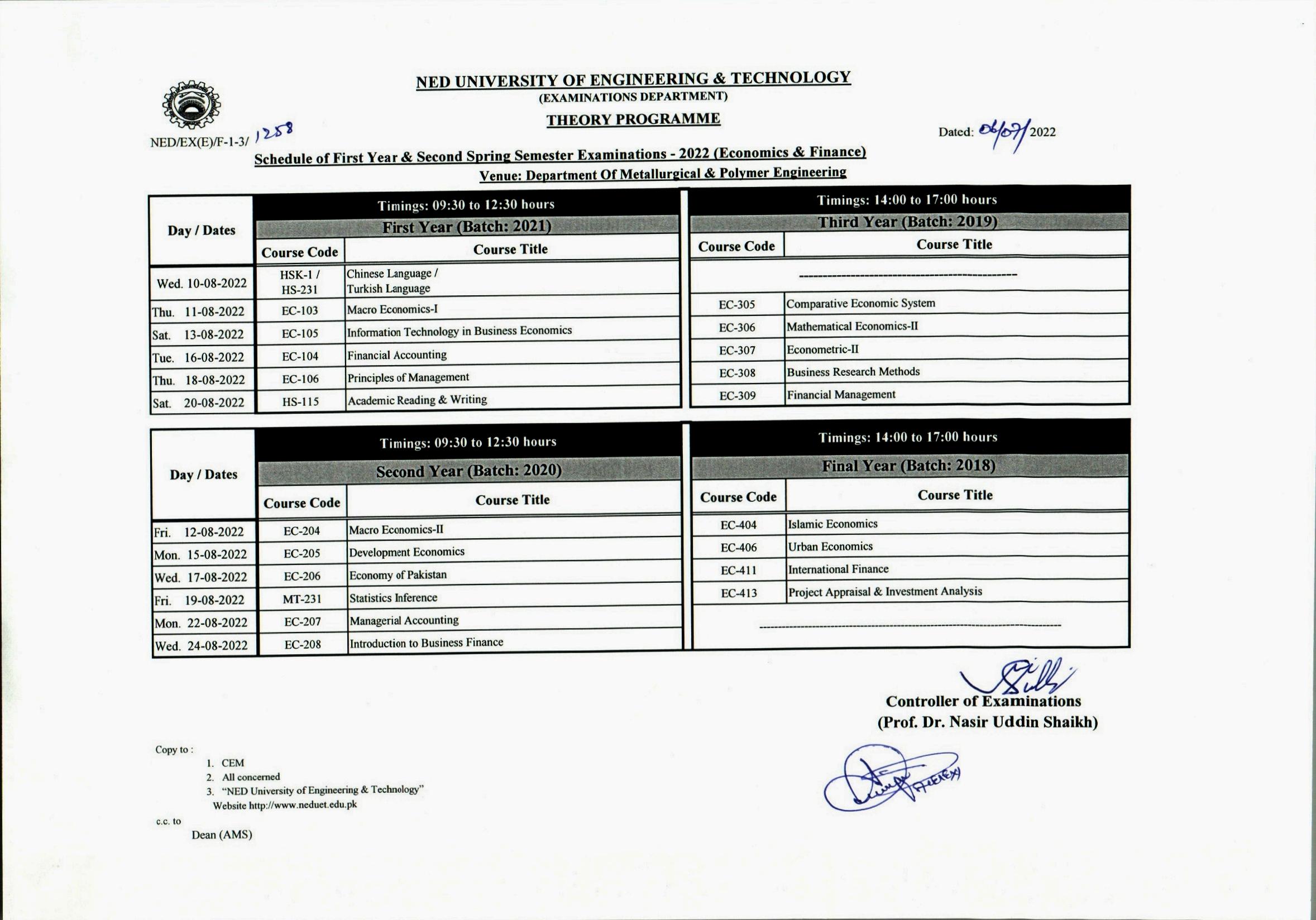 NED University BS Economics & Finance Exams Date Sheet 2022