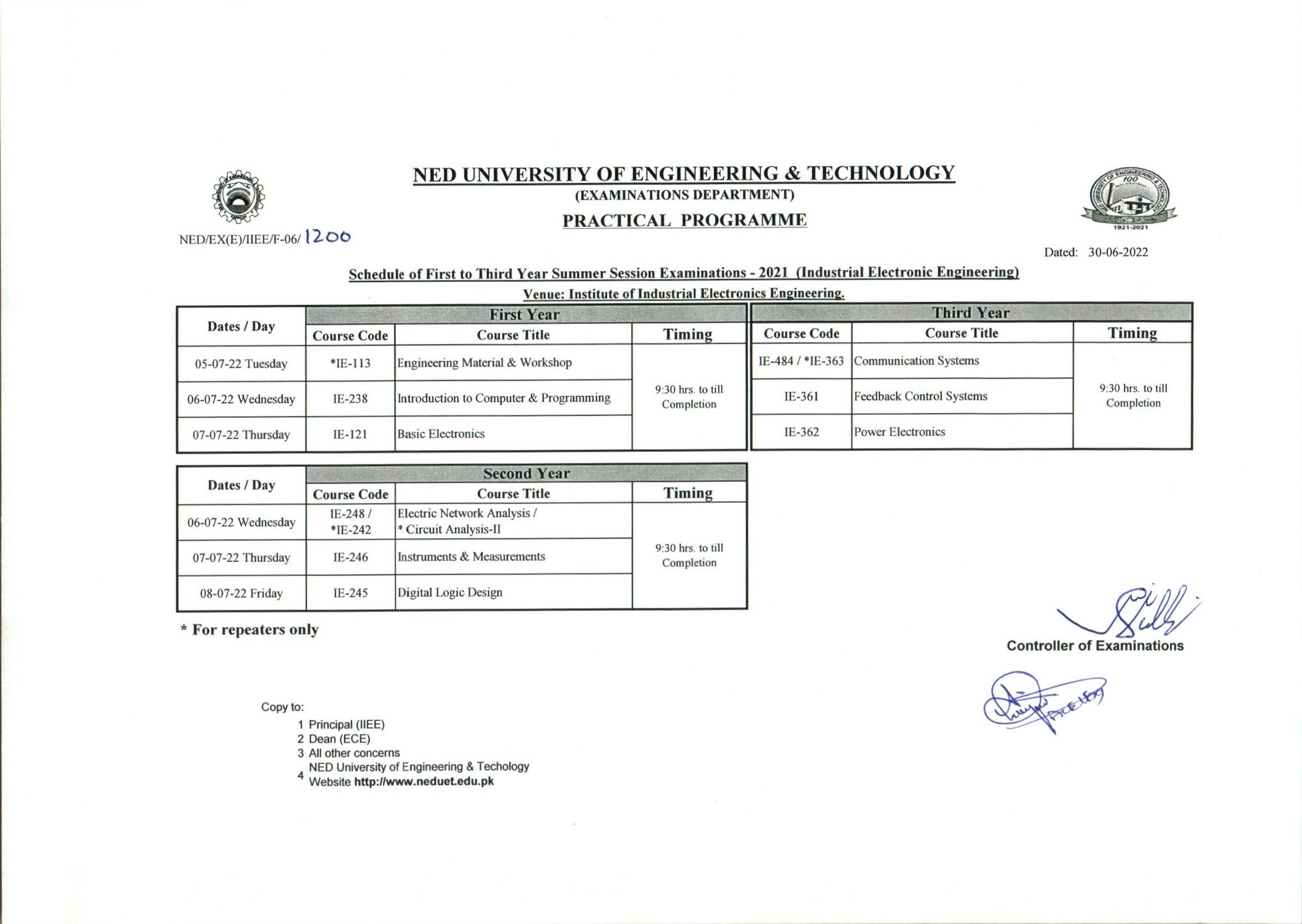 NED University of Engineering and Technology Karachi Controller of Examinations has announced the NED University Industrial Electronic Engineering Practical Exams Datesheet 2022 to arrange the NEDUET Karachi First Year, Second Year, Third Year Industrial Electronic Engineering Summer Session Examinations 2021. Examination is scheduled to be held in the month of July. As per released NEDUET Industrial Electronic Engineering Summer Practical Exams 2022 Datesheet NEDUET Karachi will hold the NED University Industrial Electronic Engineering Summer Session Examination 2022 from July 04, 2022. Moreover, all the other details regarding the commencement of the exam have been provided in order to facilitate the students as students can check in released NED University Industrial Electronic Engineering Summer Session Practical Exams Schedule 2022. Candidates must bring their Admit Card along with them in examination hall.
