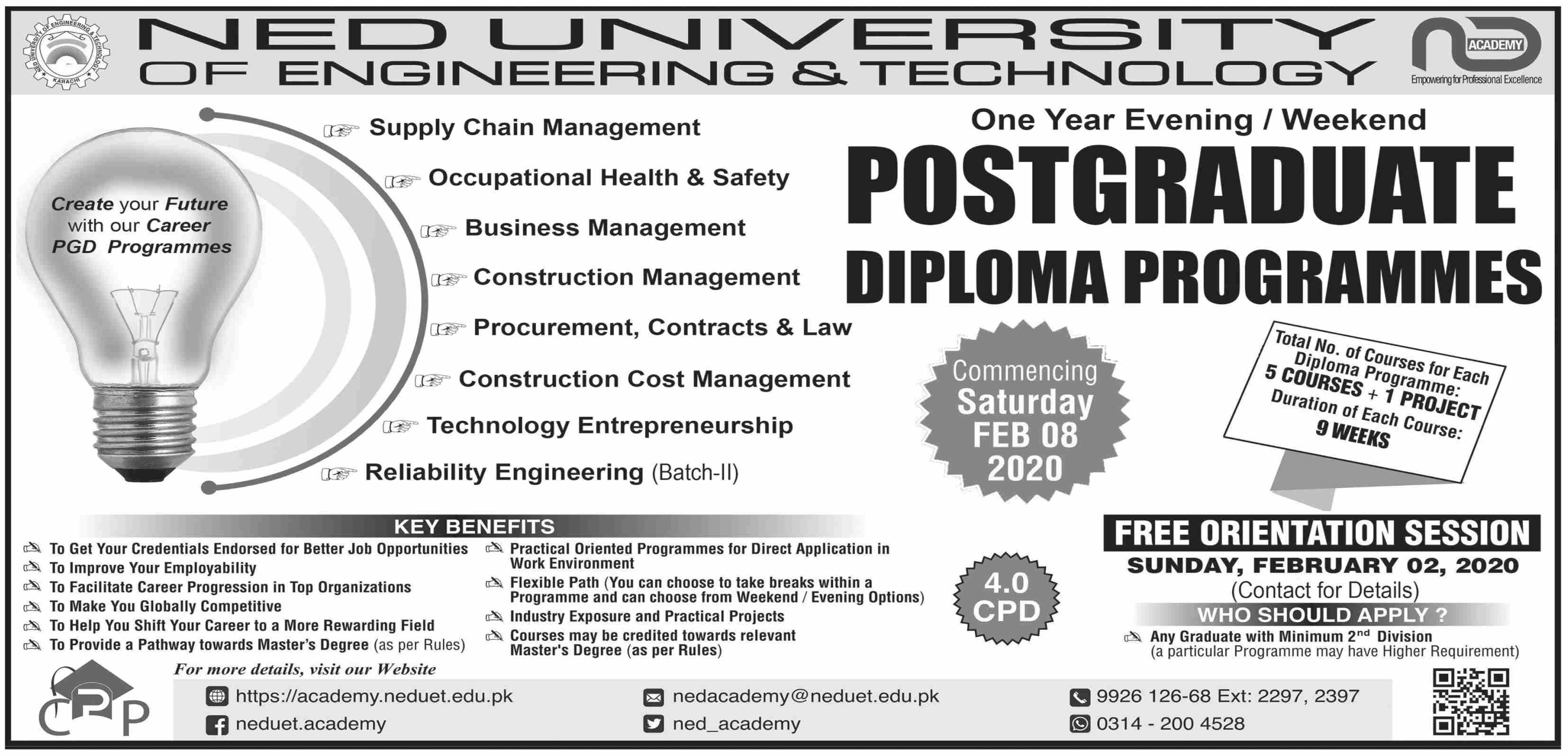 NED University of Engineering & Technology Karachi announced the Admission for the session of 2020. The NED University of Engineering & Technology Karachi has now starts the Admission in the Postgraduate Diploma Programmes. The Commencing of Classes is on 8th February, 2020.