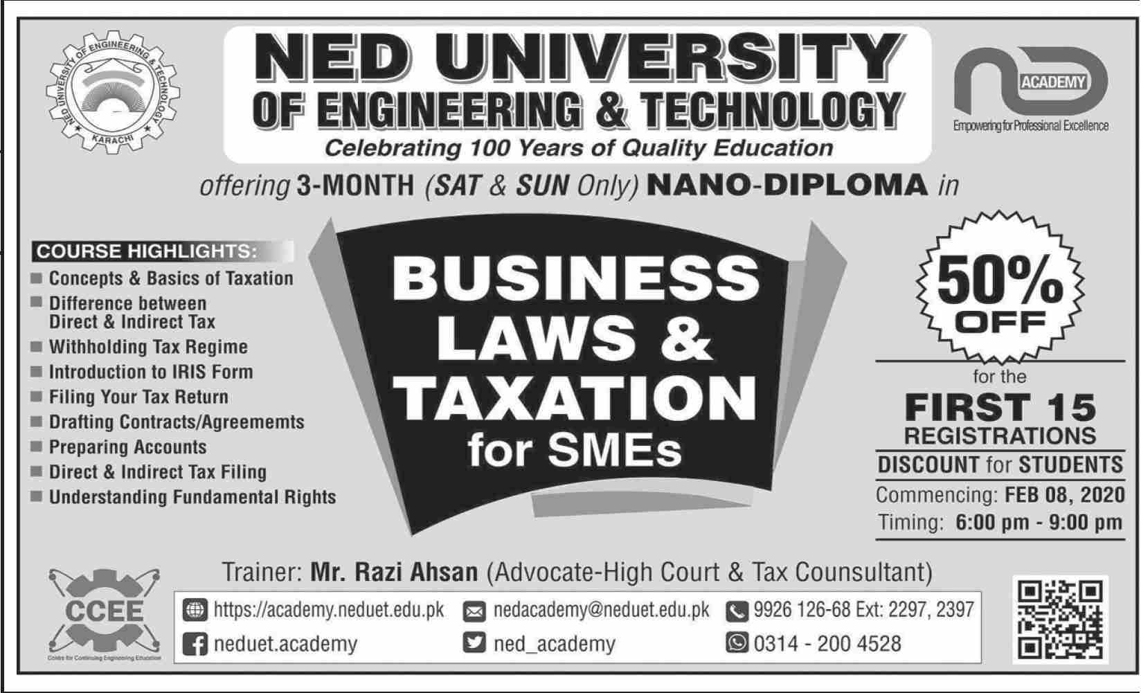 NED University of Engineering & Technology announced the Admission for the session of 2020. The NED University of Engineering & Technology has now starts the Admission in the Business Laws & Taxation for SMEs.The Commencing of Classes is 8th February, 2020.