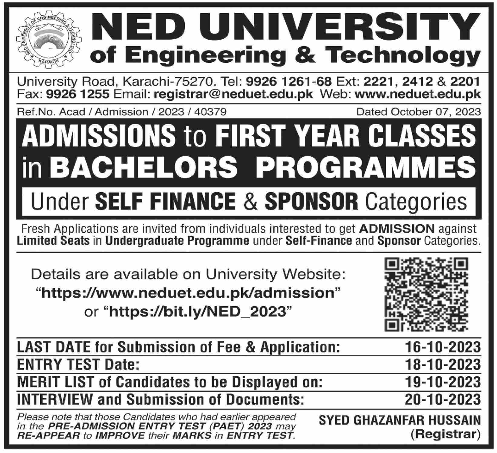 NED University of Engineering & Technology Karachi BS Admission 2023