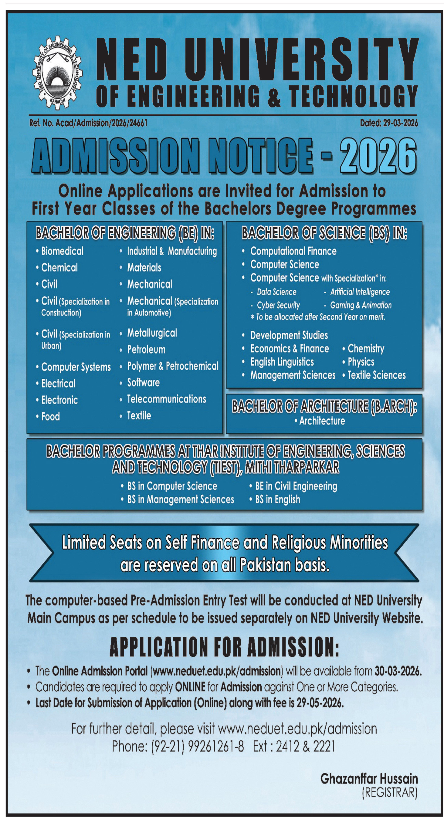NED University of Engineering & Technology, Karachi, has officially released its admission notice - 2026 for first-year classes of various Bachelors degree programs. As one of Pakistan’s oldest and most prestigious engineering institutions, NED University continues to lead in technical education, offering a wide array of specialized disciplines at its main campus and the Thar Institute of Engineering, Sciences and Technology TIEST in Mithi, Tharparkar.