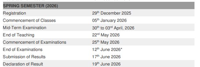 According to the schedule, registration for the Spring Semester 2026 will begin on 29th December 2025, while classes will commence from 5th January 2026. The Mid-Term Examinations are scheduled from 30th March to 3rd April 2026, followed by the end of teaching on 22nd May 2026.
