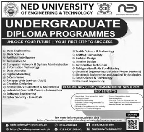 Whether youre a recent graduate or a working professional, NED Universitys diploma programs are the perfect gateway to specialize in the fastest-growing sectors. Limited seats available—apply before November 7, 2025.