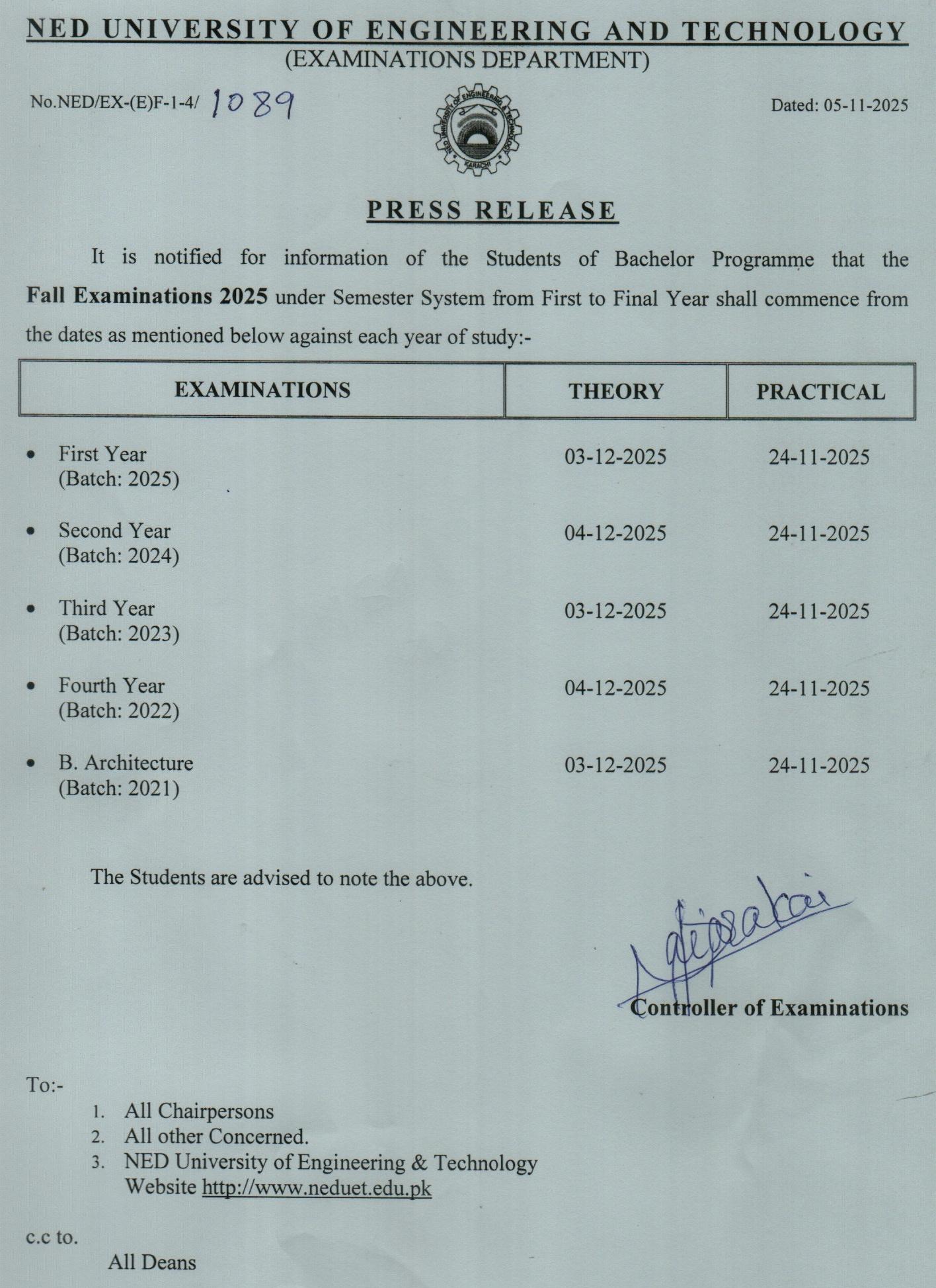 The NED University of Engineering and Technology NEDUET has officially released the schedule for Fall Examinations 2025 under the semester system for all Bachelor programs. According to the university’s Examinations Department, both theory and practical exams will be conducted for all years — from First Year to Final Year — as per the announced timetable.