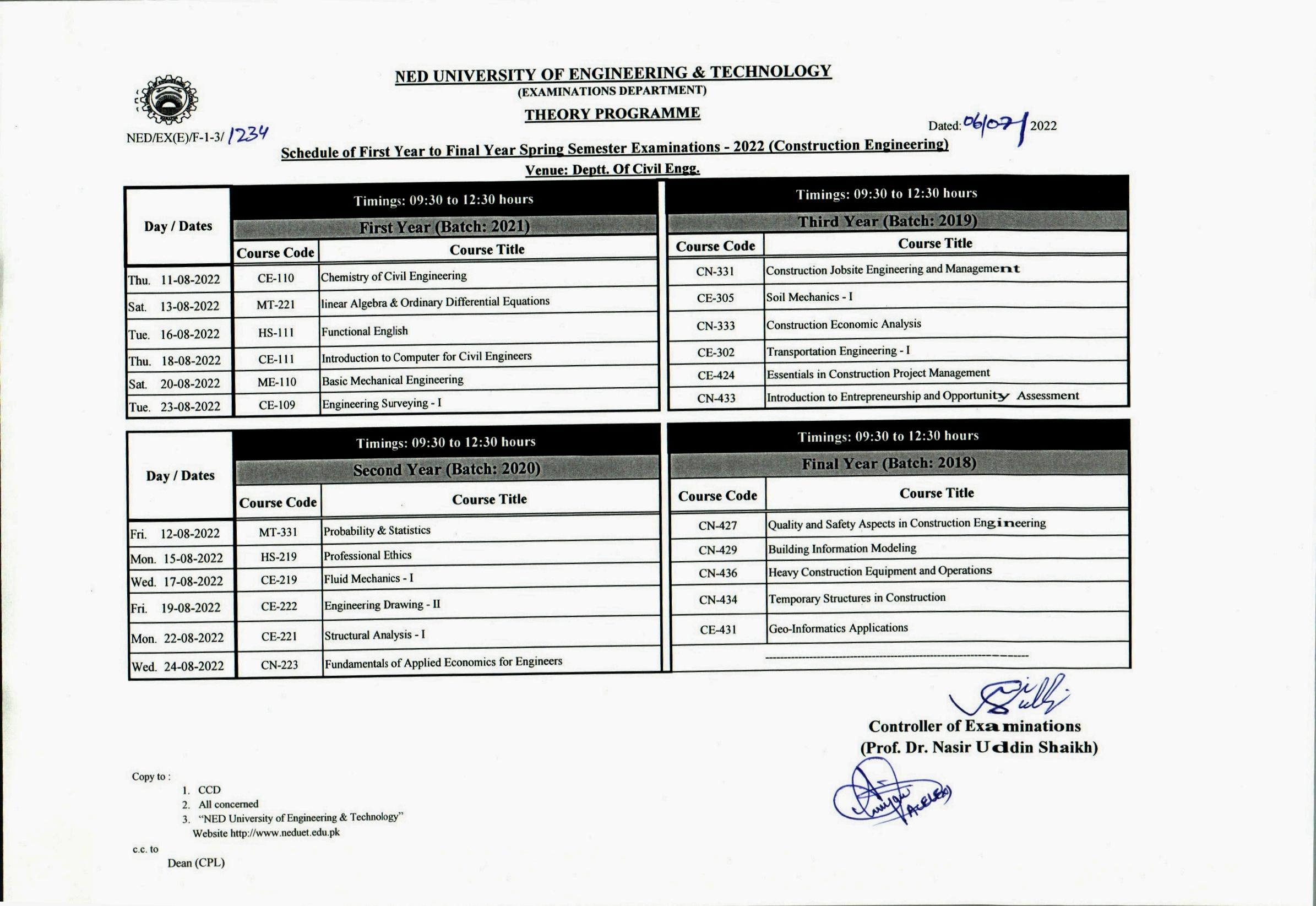 NEDUET BE Construction Engineering Exams 2022 Datesheet