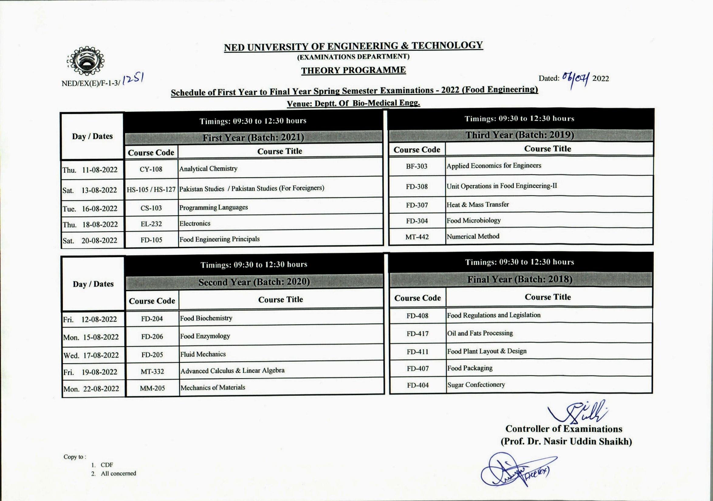 NED University of Engineering and Technology Karachi Examinations Authority is commencing the NEDUET Karachi BE Food Engineering First Year to Final Year Spring Semester Examinations 2022 and announced NEDUET BE Food Engineering Exams 2022 Date Sheet. For holding the Examination the examinations section of NED University has issued NED University First Year BE Food Engineering Exams 2022 Datesheet, NED University Second Year BE Food Engineering Exams 2022 Datesheet, NED University Third Year BE Food Engineering Exams 2022 Datesheet, NED University Fourth Year BE Food Engineering Exams 2022 Datesheet, NED University Final Year BE Food Engineering Exams 2022 Datesheet. NEDUET Karachi Examinations Section is going to manage the Spring Semester Examinations of students who enrolled in BE Food Engineering. NEDUET Exam 2022 is going to conduct in the month of August. Candidates shall be appeared in Examination according to announced NED University BE Food Engineering BE Food Engineering Exams 2022 Schedule from August 11, 2022. Any change can be made in Date Sheet according to unforeseen situation or further Government order.