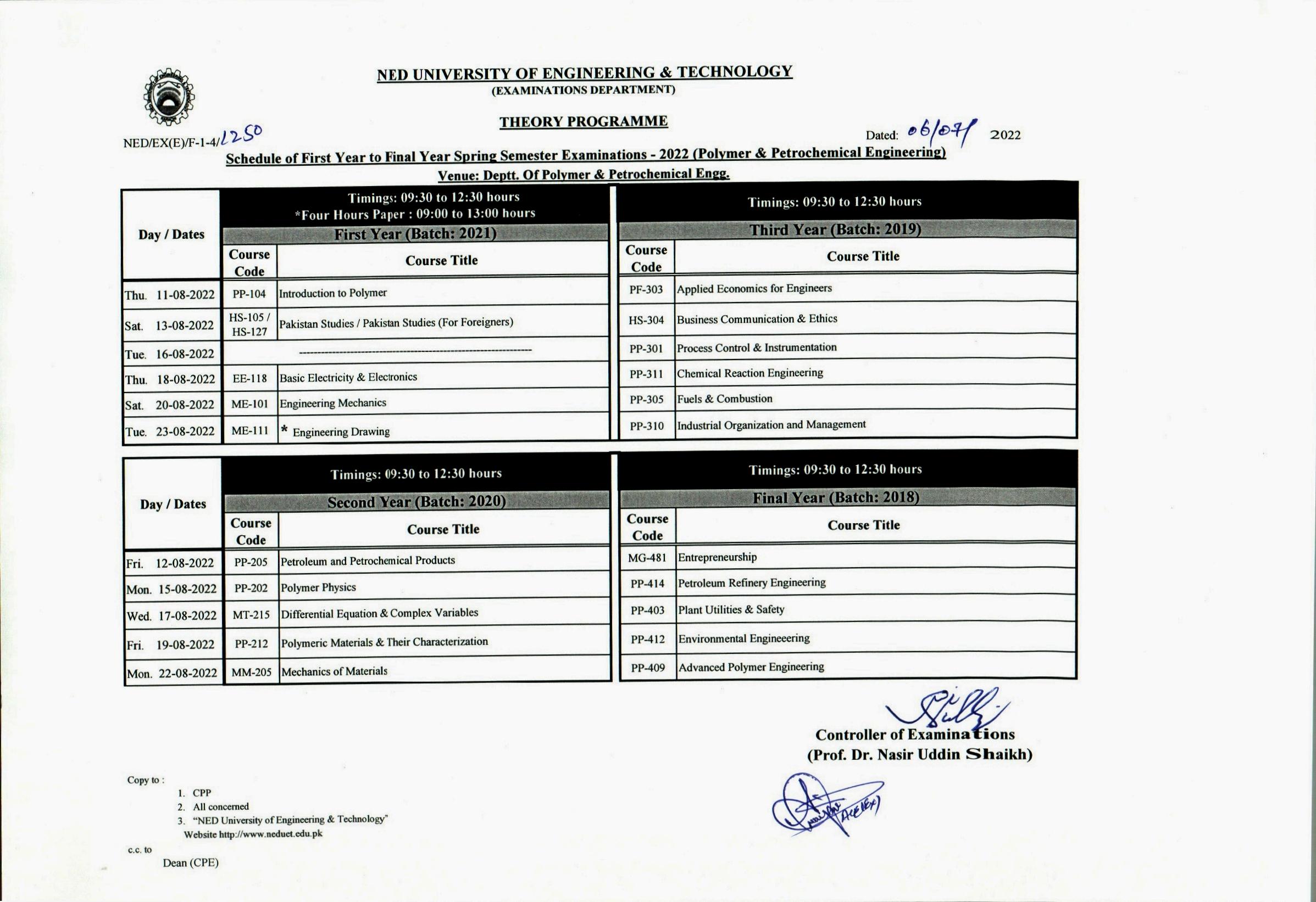 NED University of Engineering and Technology Karachi earlier accepted Examination Admissions Applications from students who were enrolled in NEDUET Karachi First Year to Final Year to appear in Spring Semester Examinations 2022. After completed the receipt of Examination Admission Forms NEDUET Karachi is updated NEDUET First Year BE Polymer & Petrochemical Engineering Exams 2022 Datesheet, NEDUET Second Yearn BE Polymer & Petrochemical Engineering Exams 2022 Datesheet, NEDUET Third Year BE Polymer & Petrochemical Engineering Exams 2022 Datesheet, NEDUET Final Year BE Polymer & Petrochemical Engineering Exams 2022 Datesheet. NEDUET Karachi has scheduled the Spring Semester Theory Examinations 2022. NED University Exam is going to be started in the month of August 2022. Candidates shall follow NED University BE Polymer & Petrochemical Engineering Exams 2022 Schedule and shall attempt exams according to announced NEDUET BE Polymer & Petrochemical Engineering Exams 2022 Datesheet from August 11, 2022. Papers will be started at 09:30 am, candidates are advised to check paper starting timings carefully according to their respective paper/subject.