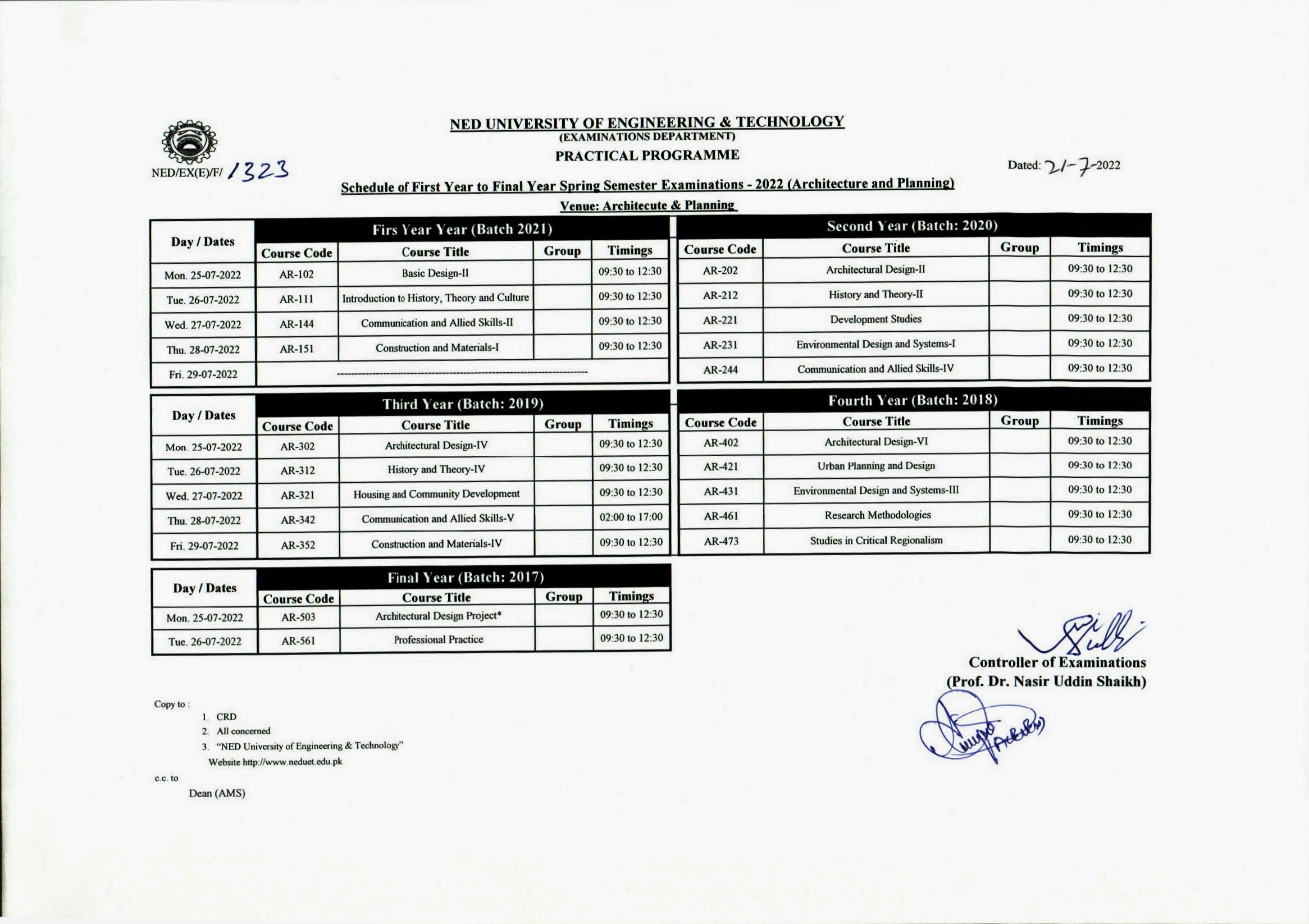 NEDUET BS Architecture & Planning Exams 2022 Practical Datesheet