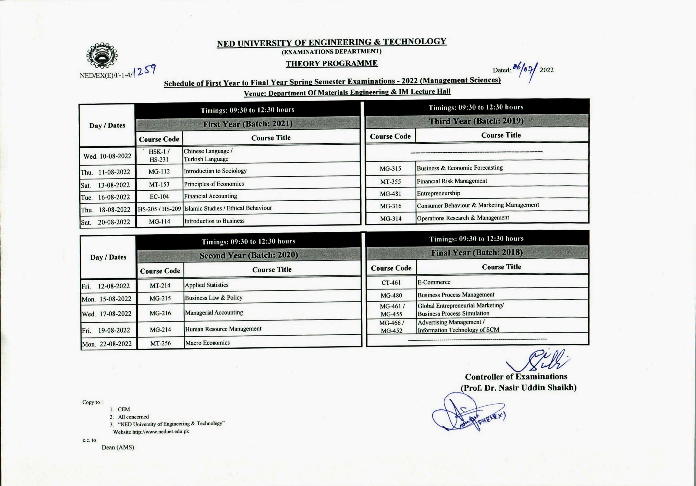 NED University of Engineering and Technology Karachi has updated the NEDUET BS Management Sciences Exams Datesheet 2022 for upcoming Spring Semester Examinations 2022. NEDUET Karachi is arranging Spring Semester Examination 2022 for the students enrolled in BS Programmes who are doing preparation to attempt their Final Examination 2022. NEDUET Karachi is conducting the NED University Spring Semester Examinations 2022 for the students of BS Management Sciences First Year to Final Year. Candidates shall follow NEDUET BS Management Sciences First Year Exams Datesheet 2022, NEDUET BS Management Sciences Second Year Exams Datesheet 2022, NEDUET BS Management Sciences Third Year Exams Datesheet 2022, NEDUET BS Management Sciences Final Year Exams Datesheet 2022 from starting of the exam. Exam is starting from August 10, 2022. Students shall bring their Roll Number Slip with them in examination hall and produce on demand.