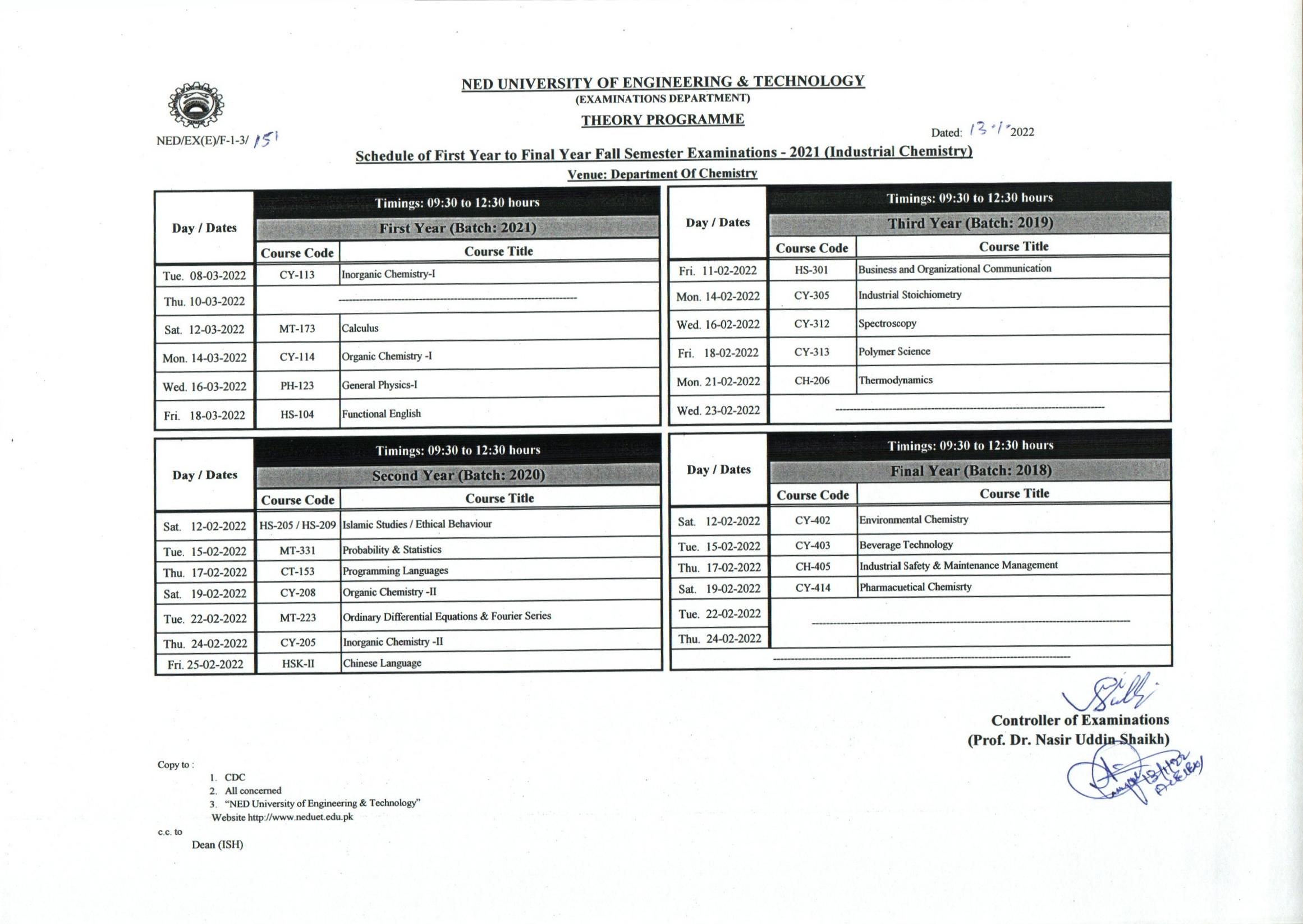 NEDUET Karachi BS Industrial Chemistry Fall Exams 2021 Schedule 2022