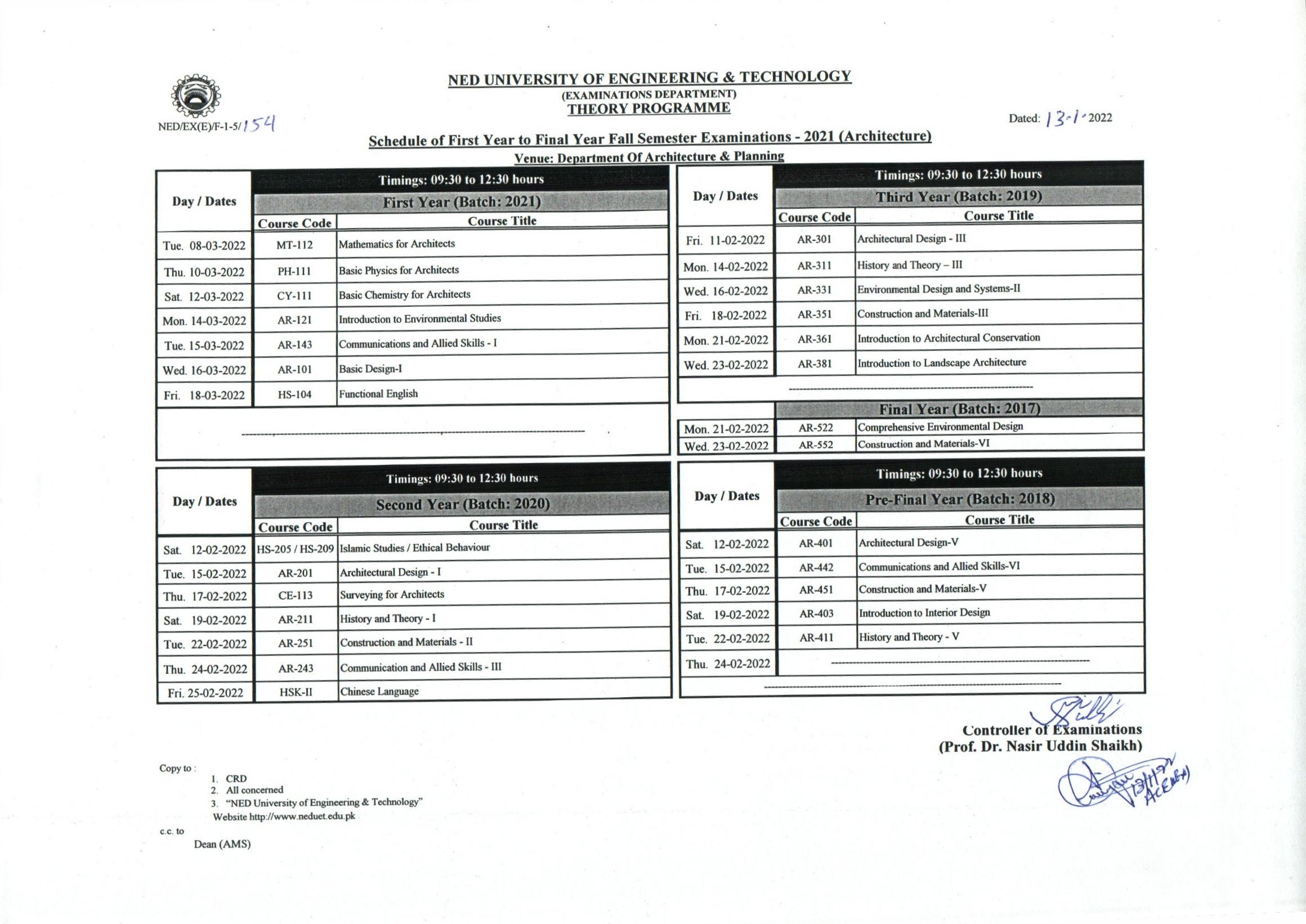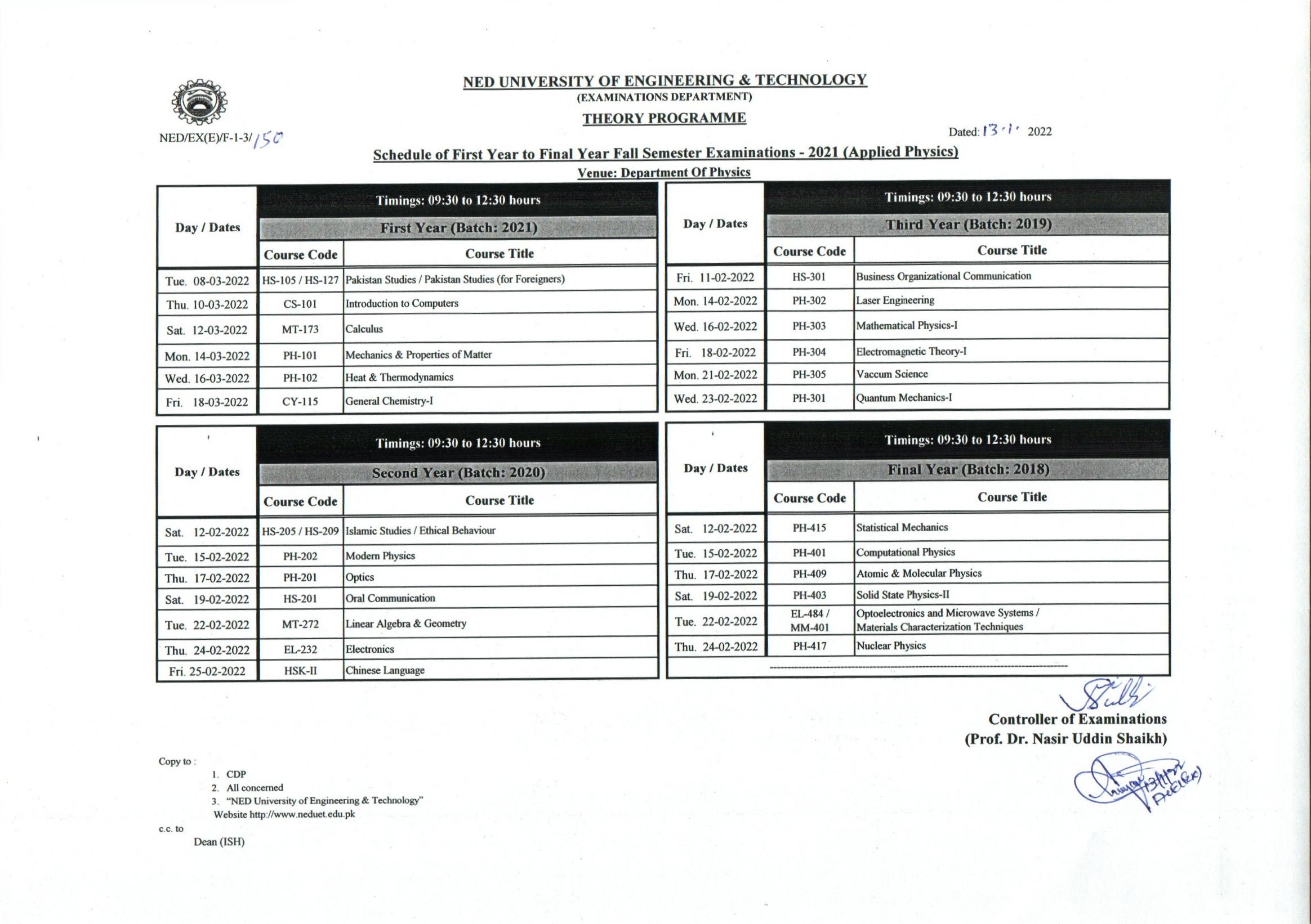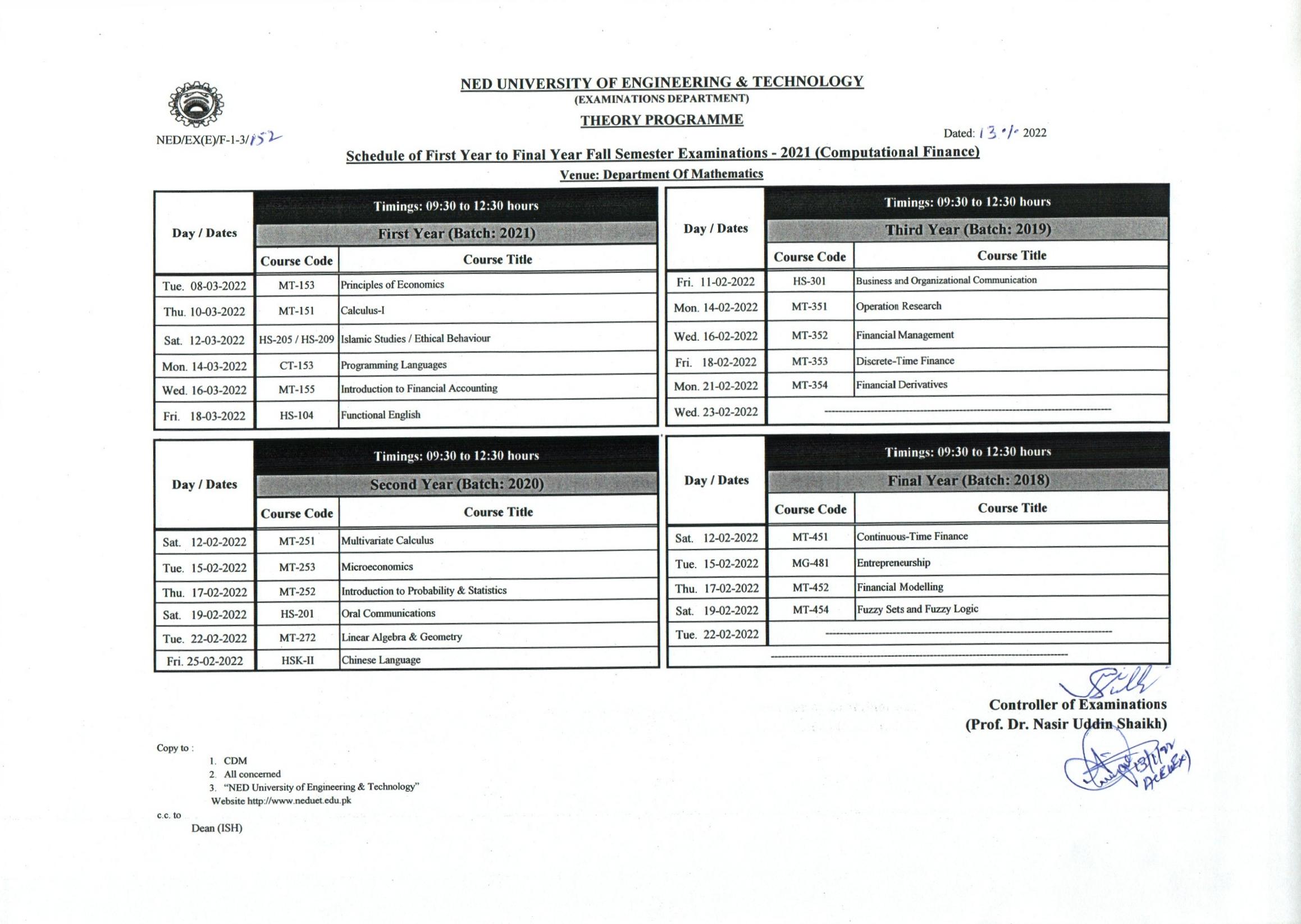 NEDUET Karachi Undergraduate Fall Semester Exam 2021 Date Sheet 2022