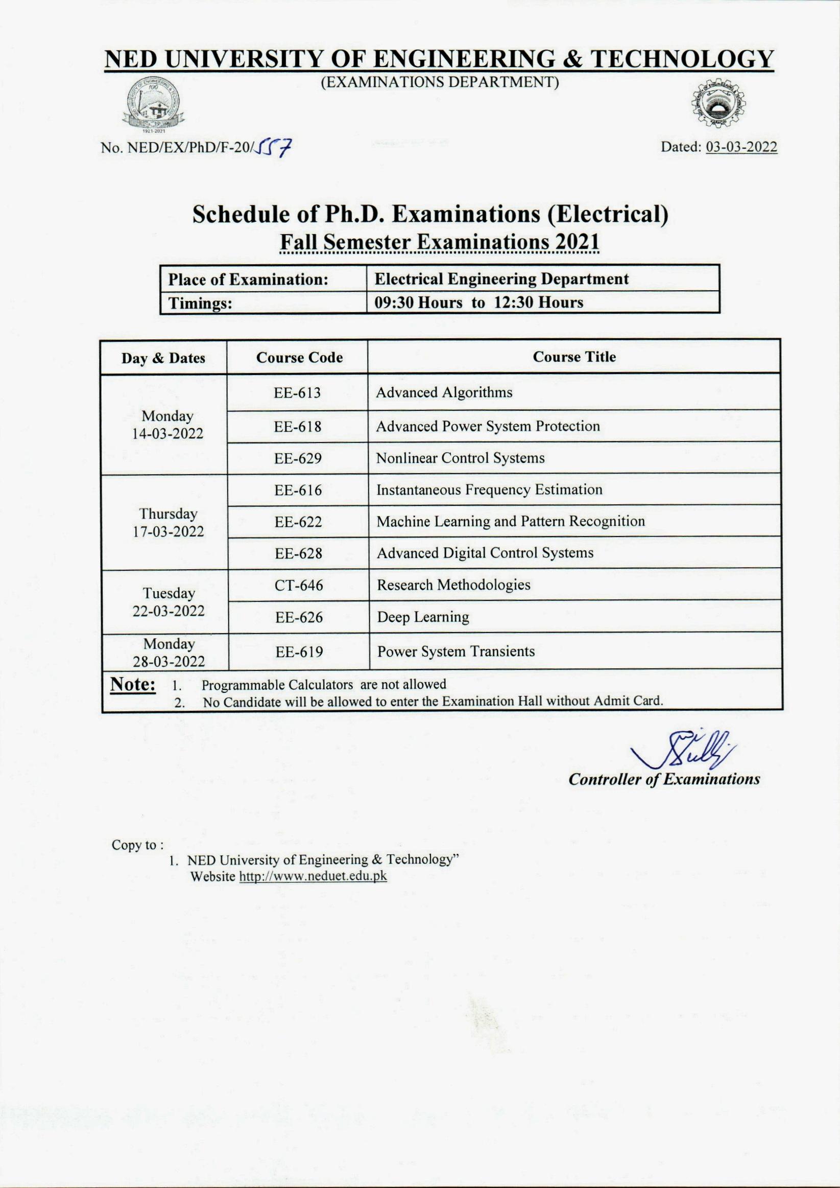 PhD Electrical Engineering Exams 2021 Schedule 2022
