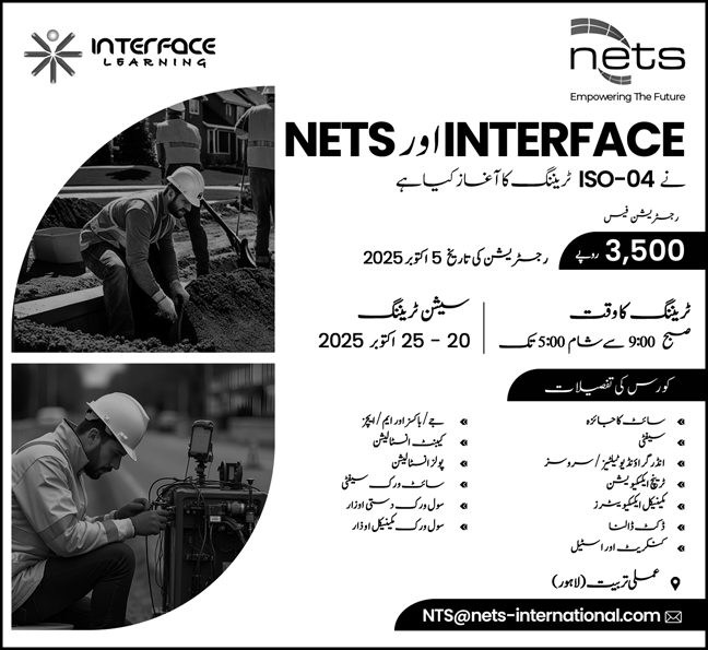 INTERFACE in collaboration with NETS International proudly announces for admissions 2025 of its ISO-04 Certified Training Program, aimed at equipping participants with hands-on skills essential for the modern workforce. This initiative is part of their ongoing mission to empower individuals through technical learning and career-focused development.