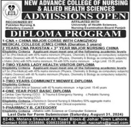 New Advanced College of Nursing & Allied Health Sciences NACNAHS is now accepting applications for its Diploma Programs for the academic year 2024. This prestigious institution is dedicated to providing top-quality education and training in the fields of nursing and allied health sciences.