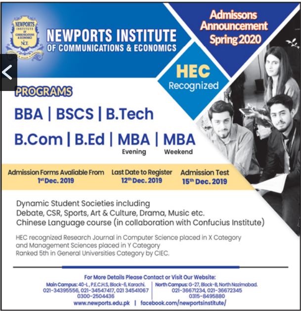 Newports Institute of Communications & Economics Karachi has offered admissions for BBA, BSCS, B.Tech, B.Com, MBA, BEd. Last date for submission of admission applications is 12 Dec 2019. Admission Test will be conducted on 15 Dec 2019.