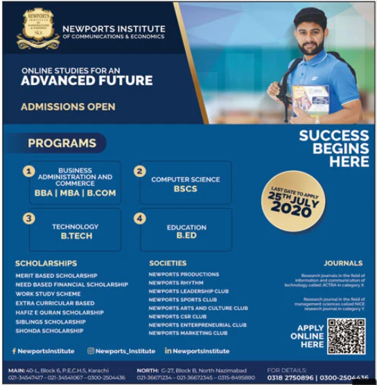 Newports Institute of Communications & Economics has announced admissions 2020 in BBA, MBA, B.Com, BS Computer Science BSCS, B.Tech, B.Ed in Karachi.