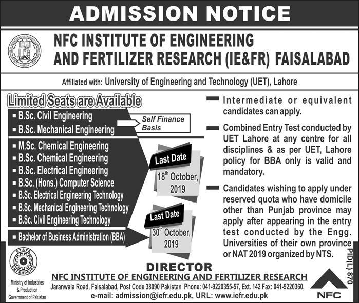 NFC Institute of Engineering & Fertilizer Research Faisalabad has announced admissions for BSc in Civil Engineering, Mechanical Engineering, Electrical Engineering, Chemical Engineering, BBA, MSc in Chemical Engineering. Entry test will be conducted by NTS. Last date to apply is 18 Oct 2019.